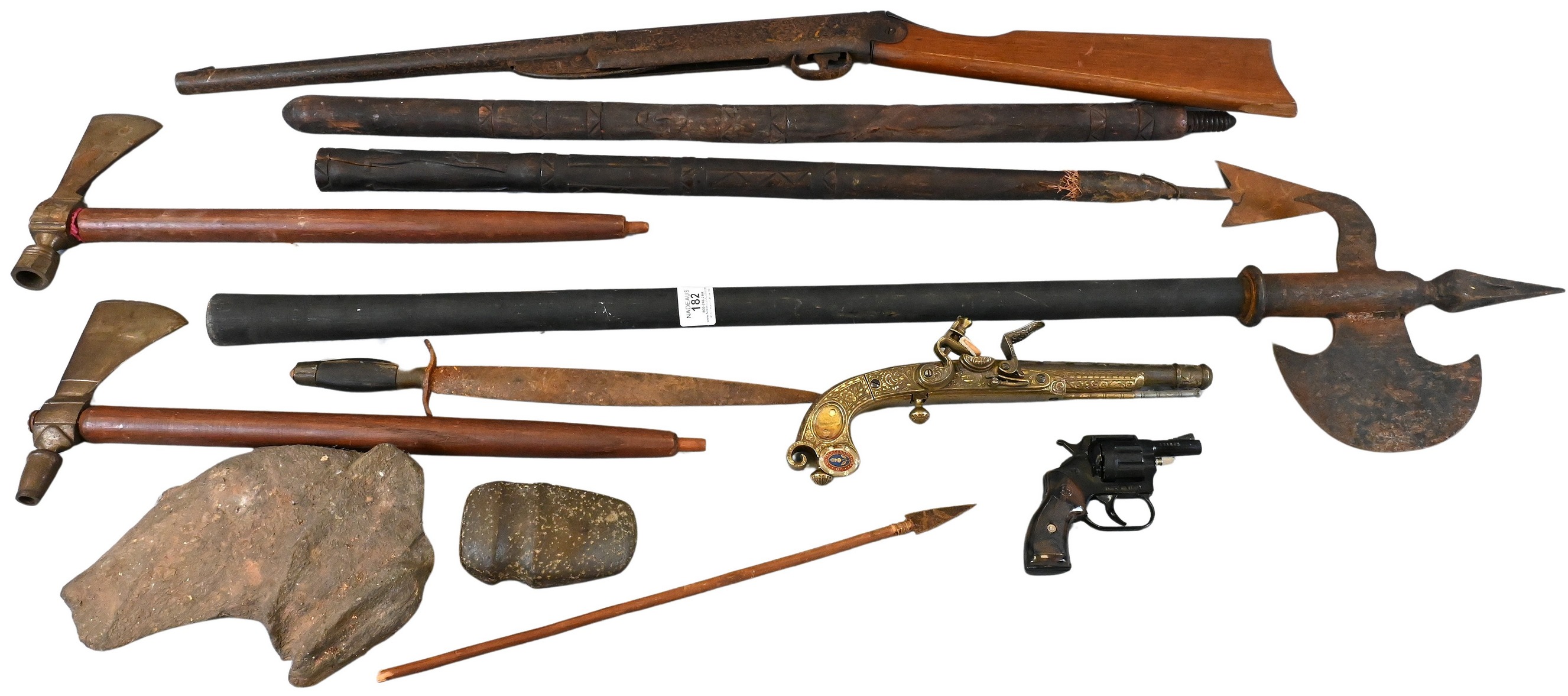 to include two tomahawk peace pipes, two spear halberds, knife, arrow, stone axe heads, along with Murdoch flintlock two pistol replicas, air rifle, and starter pistol
