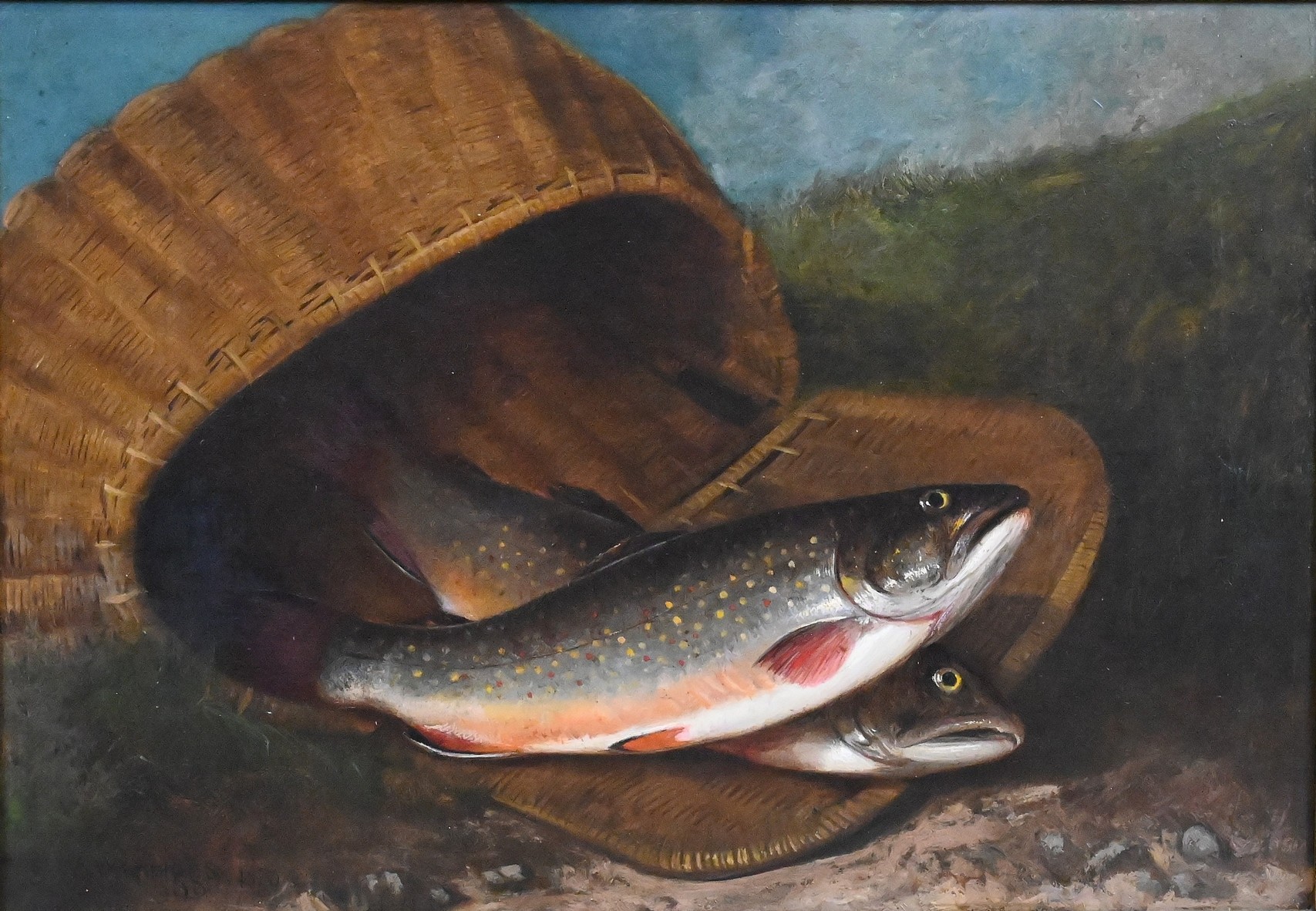 Fish Still Life of Two Rainbow Trout in a Basket, 1870