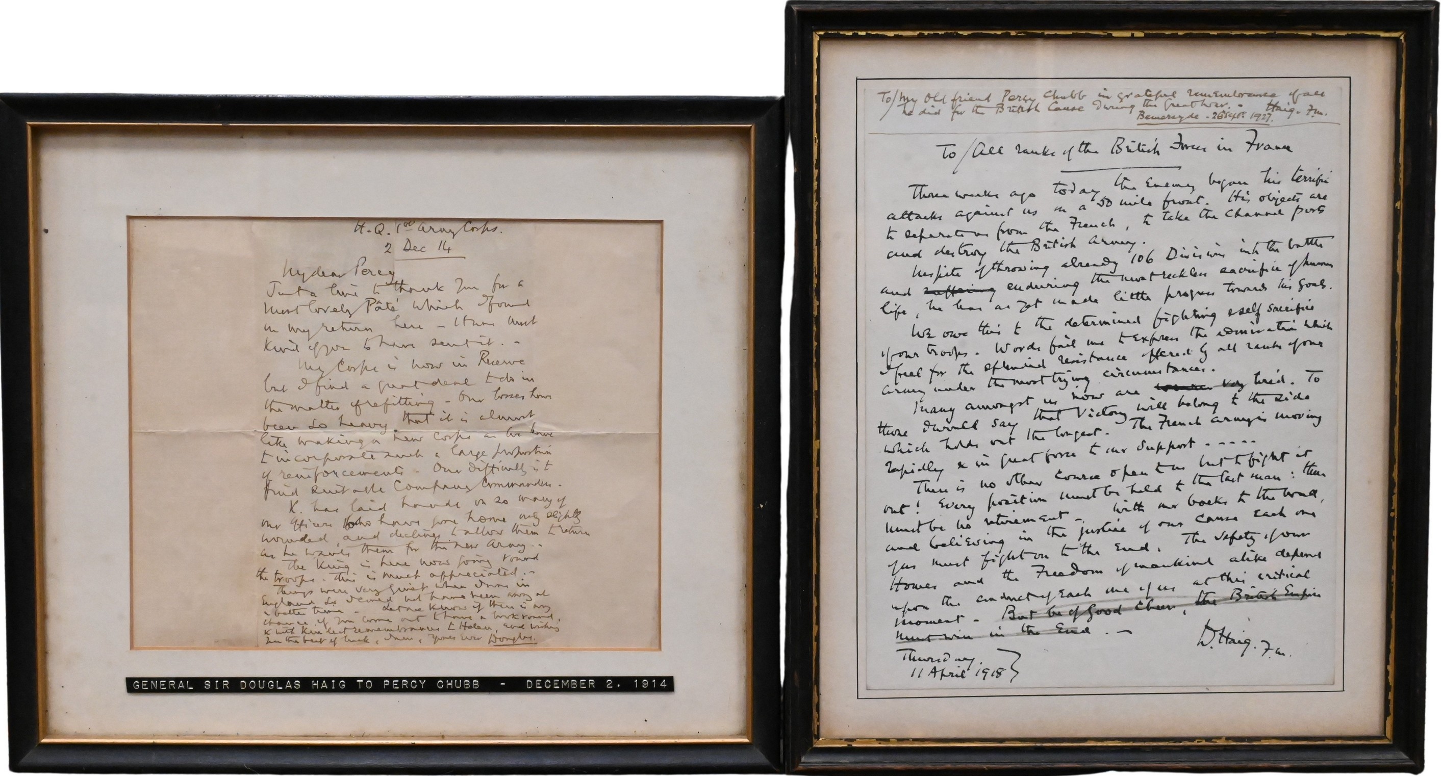 handwritten letter by General Sir Douglas Haig to Percy Chubb, December 2, 1914 along with an annotated copy of Haig’s 1918 “Backs Against the Wall”-To all the British Forces in France” letter with inscription to Percy Chubb dated 1927