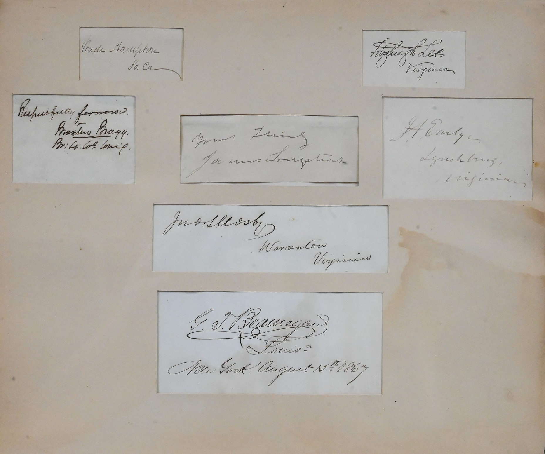 A framed group of clipped autographs from leading Confederate generals and officers, including General Braxton Bragg, General Wade Hampton, General Fitzhugh Lee, General Joseph E. Johnston, Col. John S. Mosby (“The Gray Ghost”), General Jubal Anderson Early and Gen. P.G.T. Beauregard (the letter dated New York, August 4, 1868). Each signed in ink on paper, mounted together in a single display.