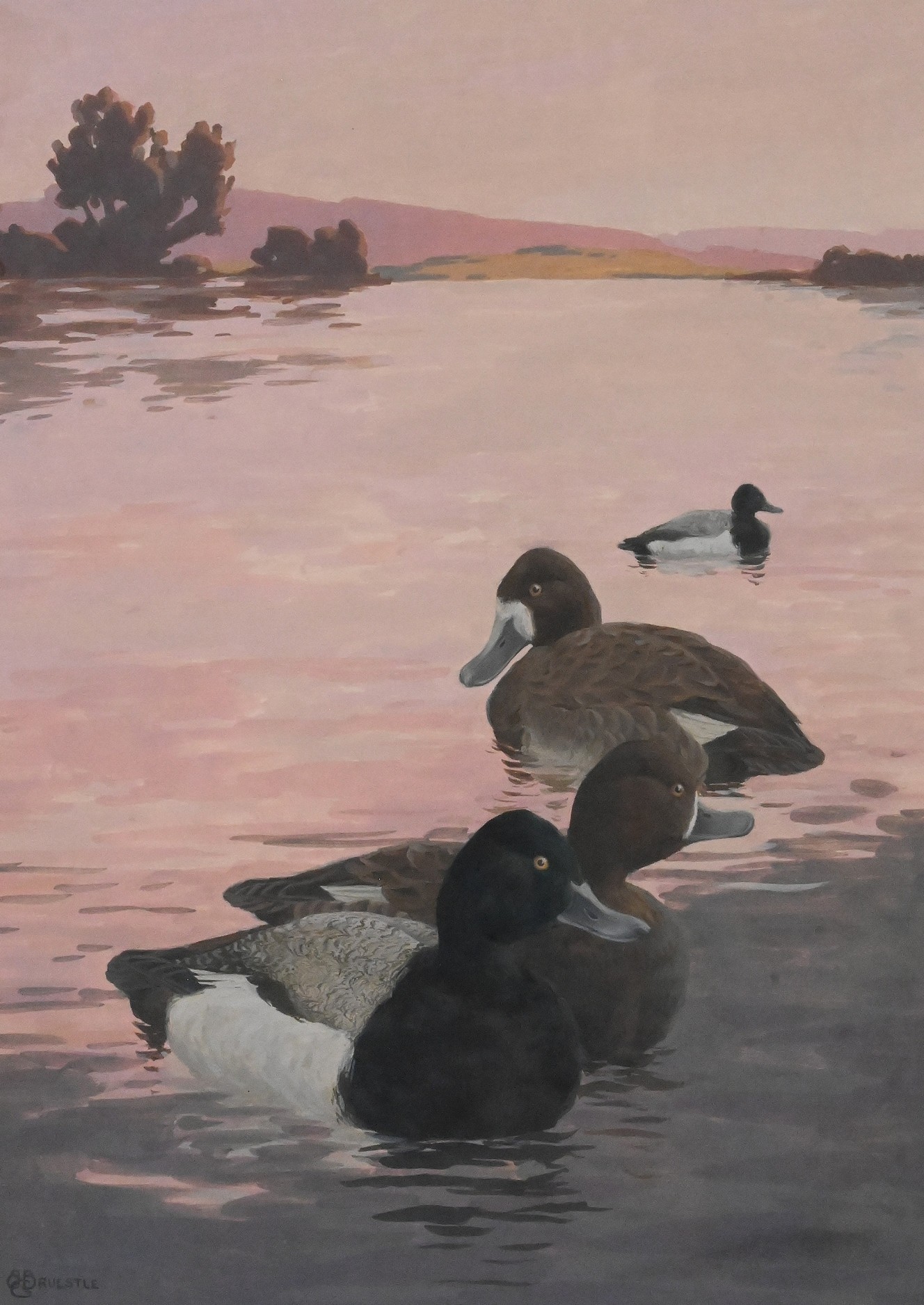 “Greater Scaups”, Ducks on a Sunset Lake