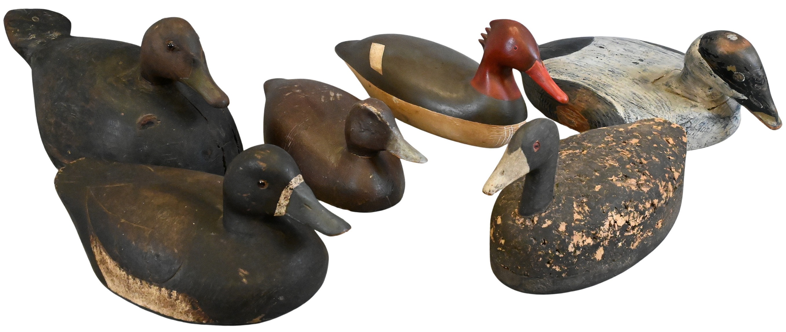 to include a black duck, New York having some original paint, age cracks, shrinkage, highly stylized tial carvings, a Seiler Julius Mittelstaedt, repainted broad bill hen, a Broad Bill hen having incised wing carving, possibly original paint, cork construction with 3/4 inch pine bottom board, weight, and a Swimming Eider Drake, Canada, inleted head, some original paint mostly working repaint, original line tie etc…