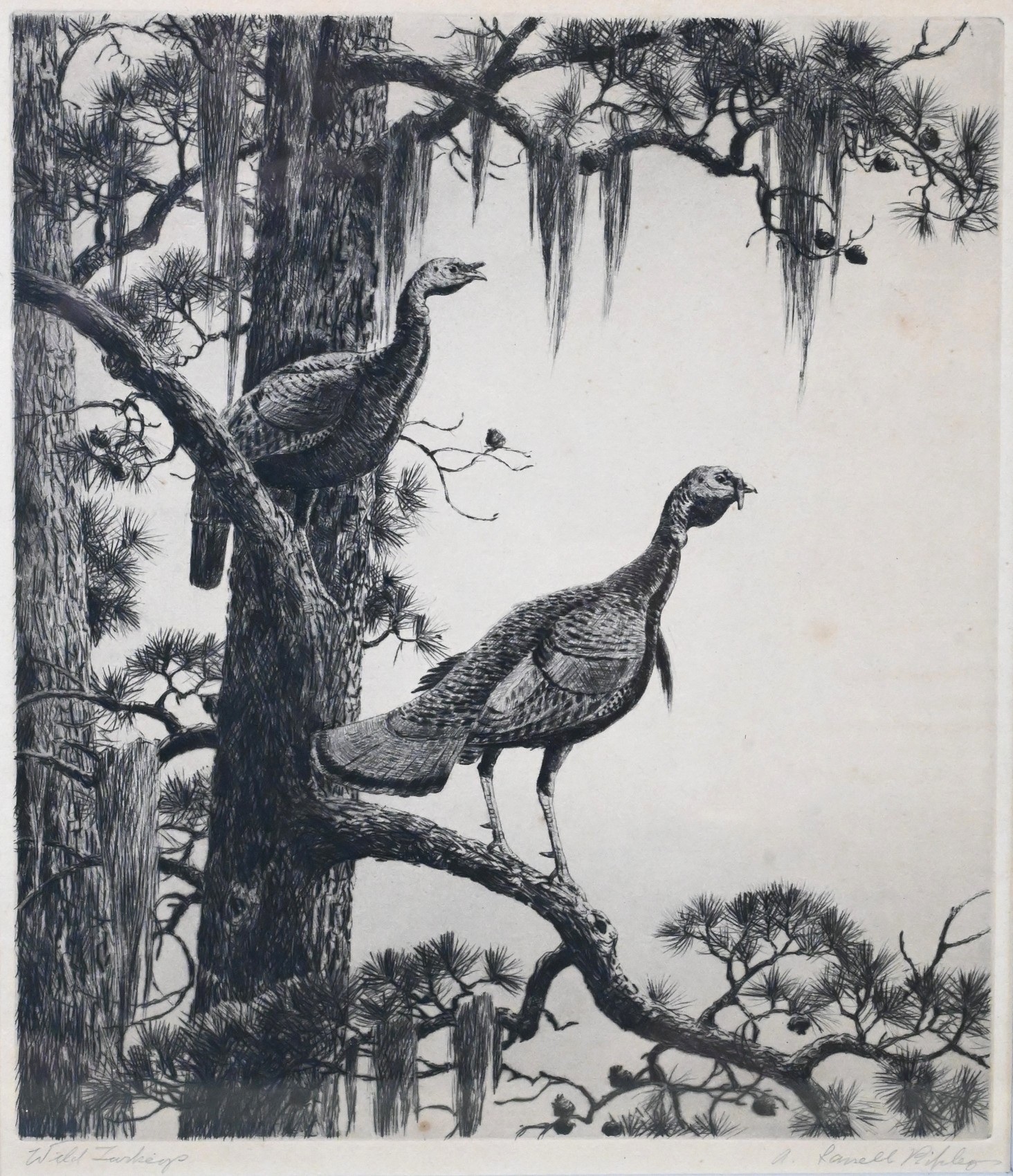 Depicting a pair of wild turkeys perched in a pine tree, with hanging moss and wooded background.