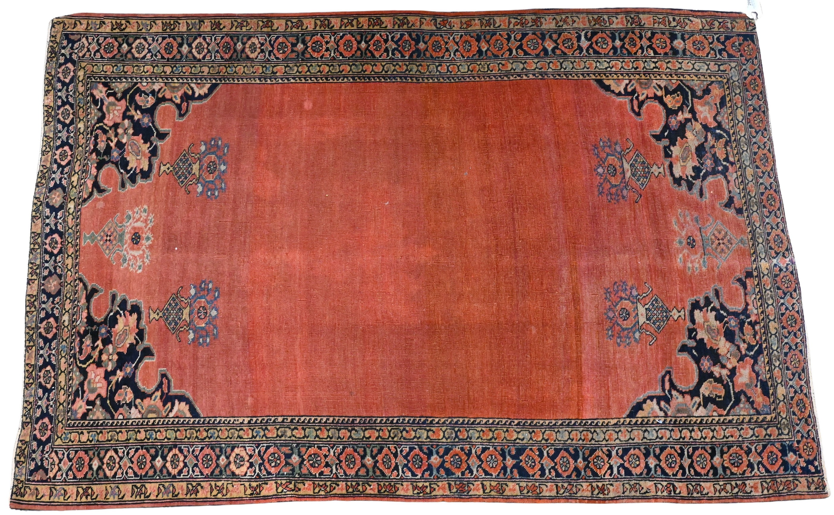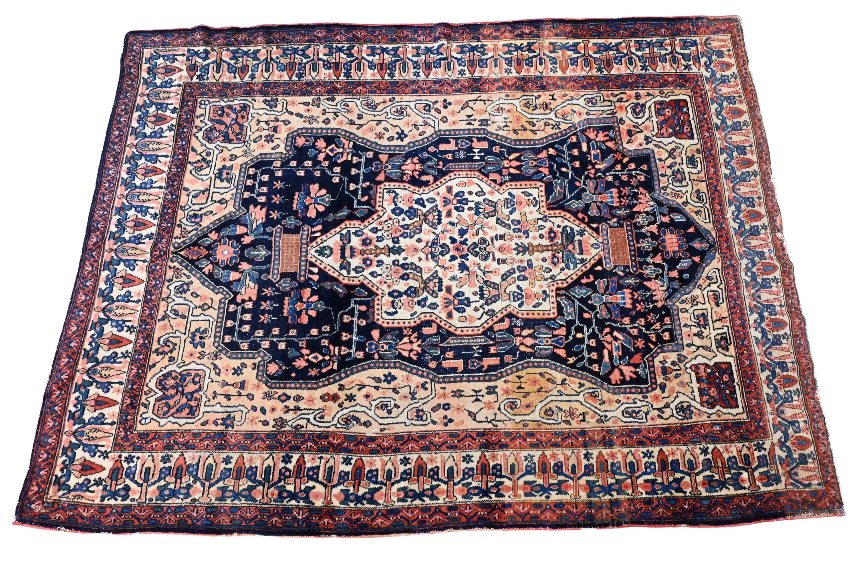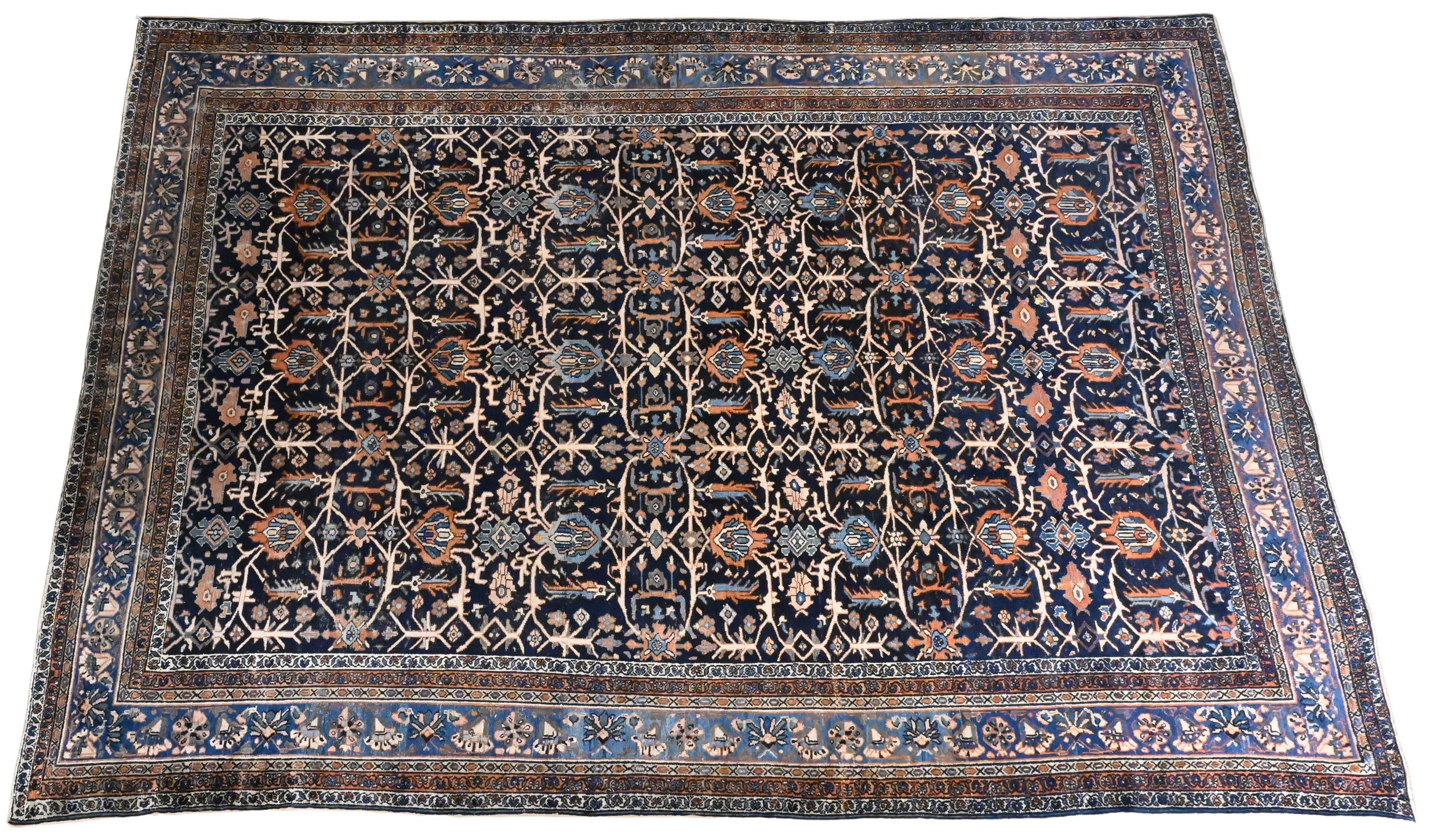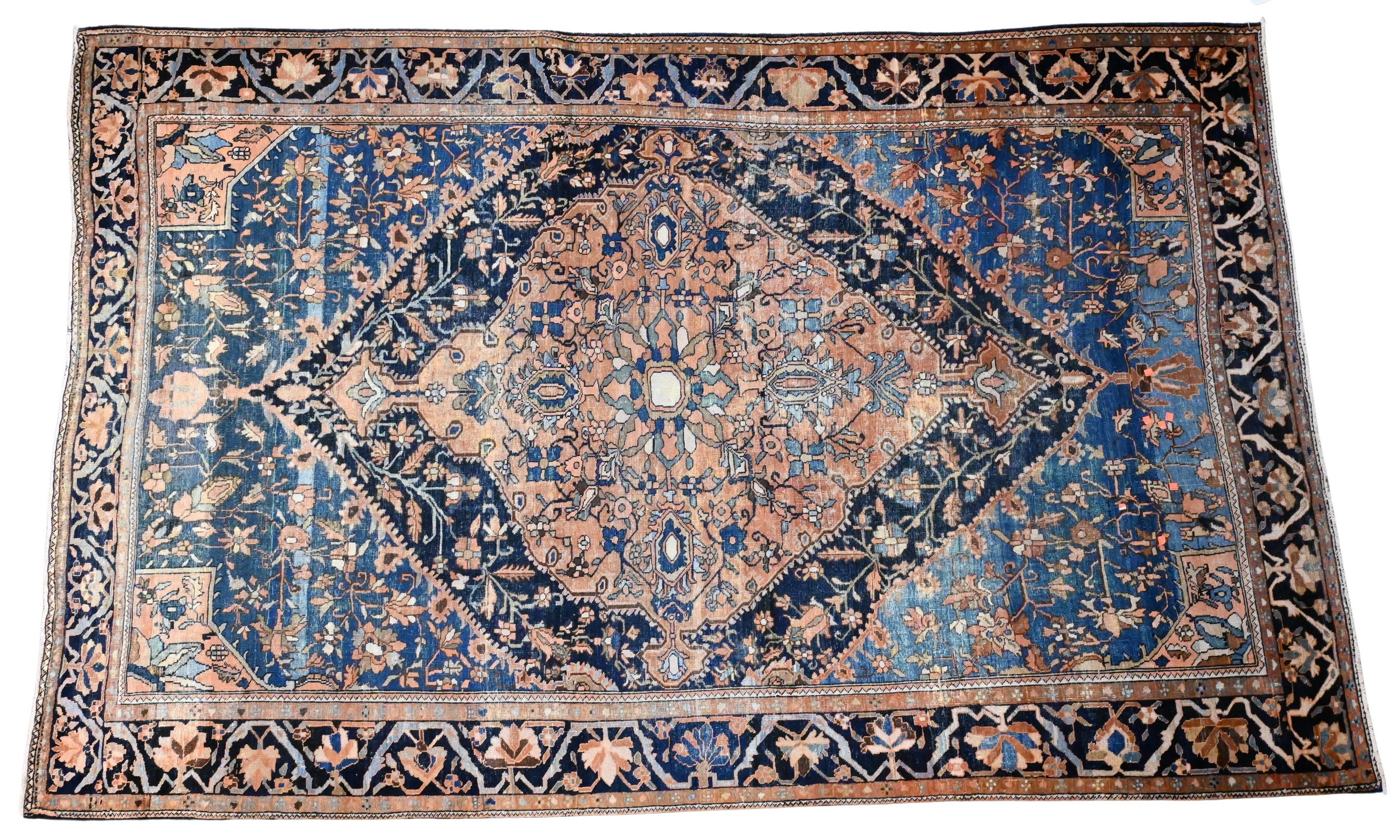 A Persian Farahan Sarouk carpet with floral sprays on a blue field, framed by floral borders in camel, ivory, and indigo.