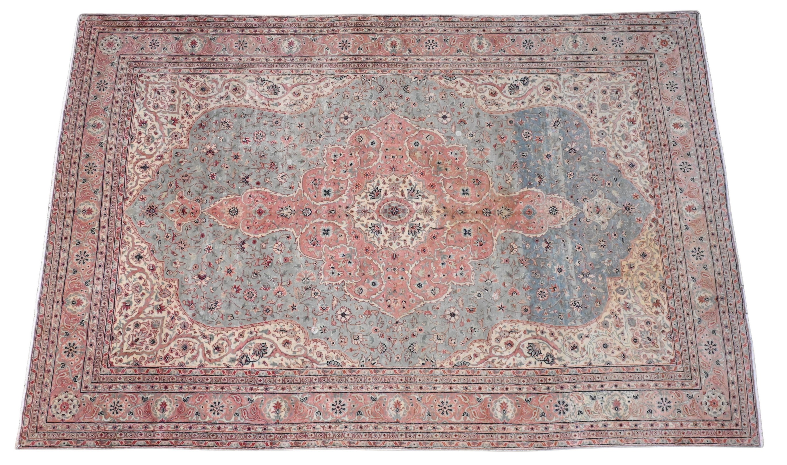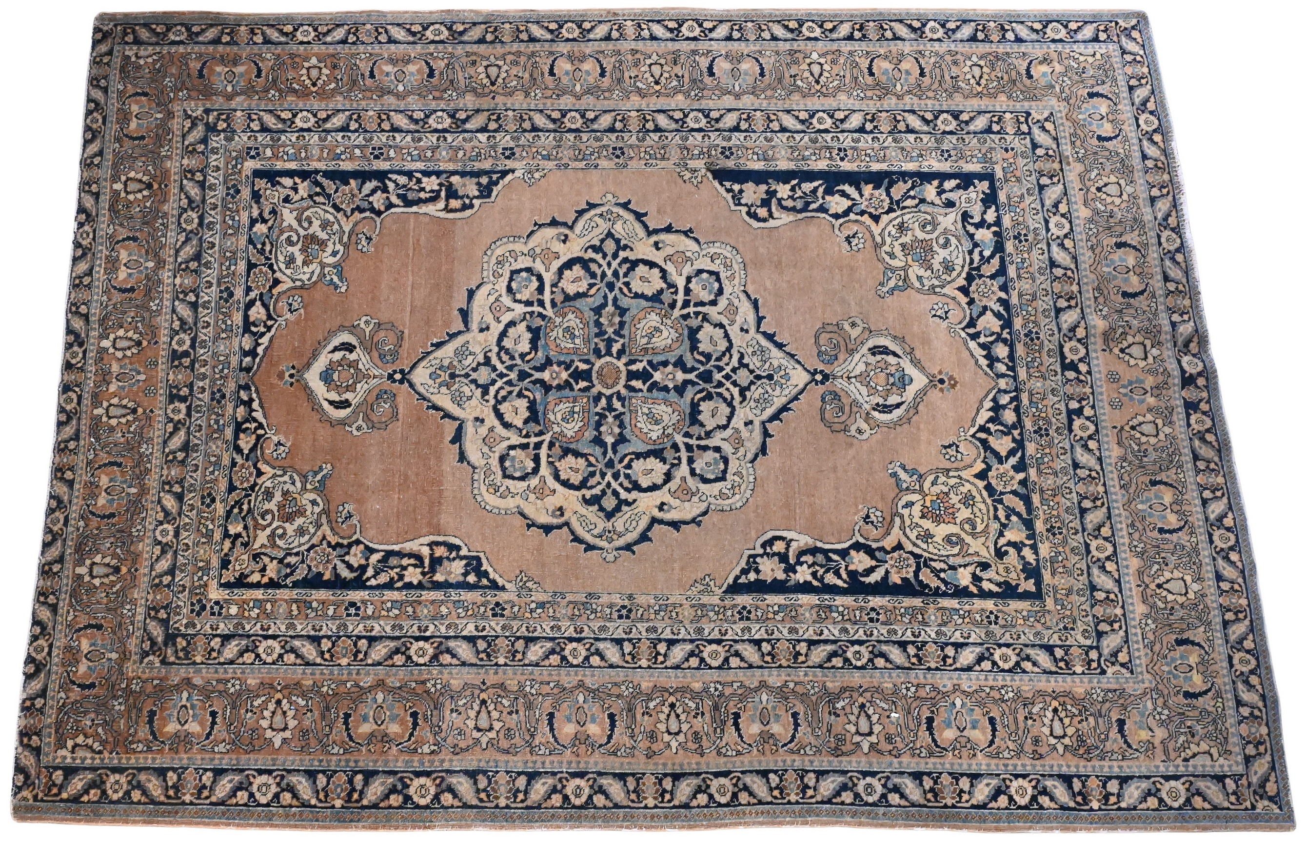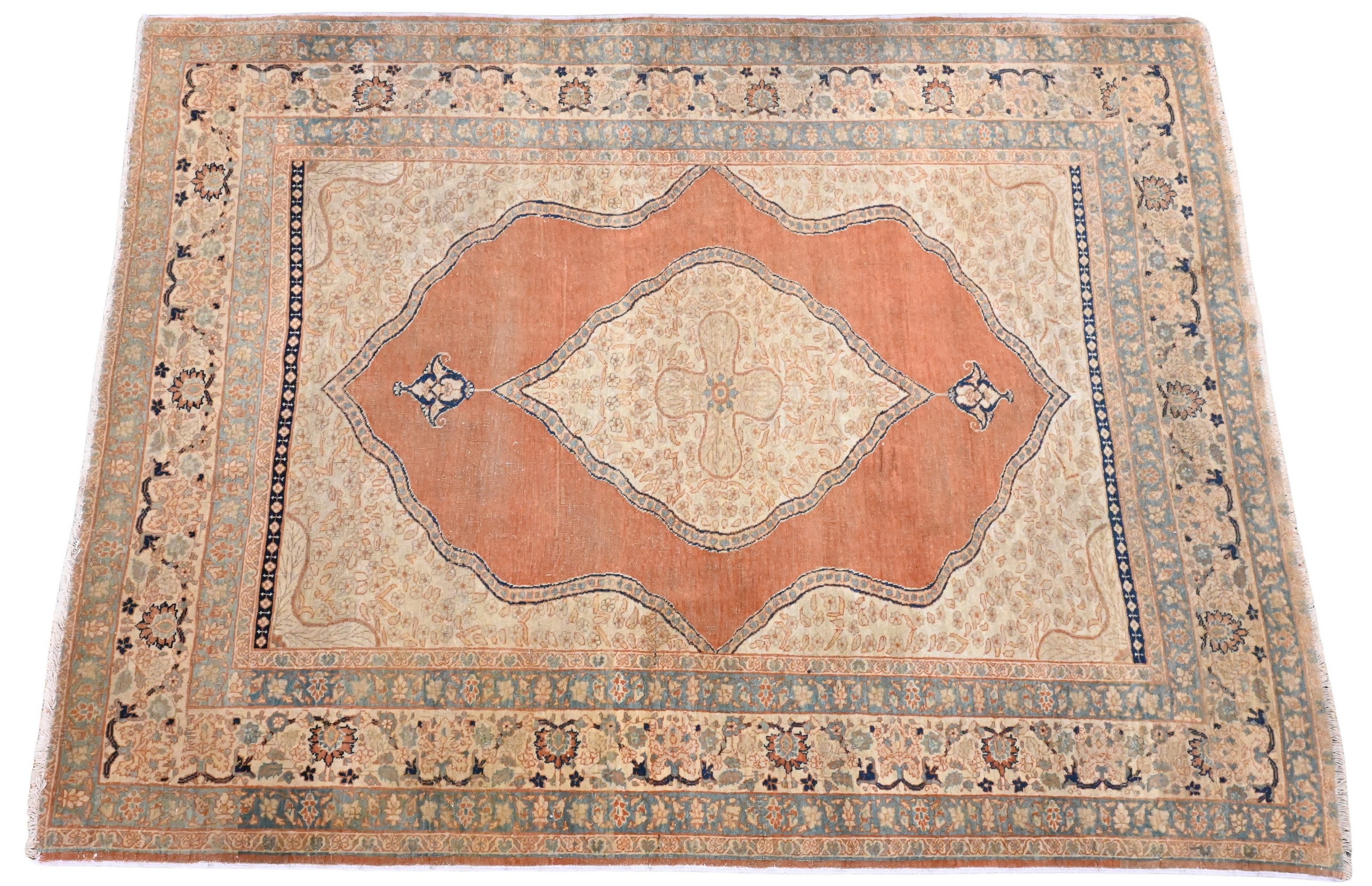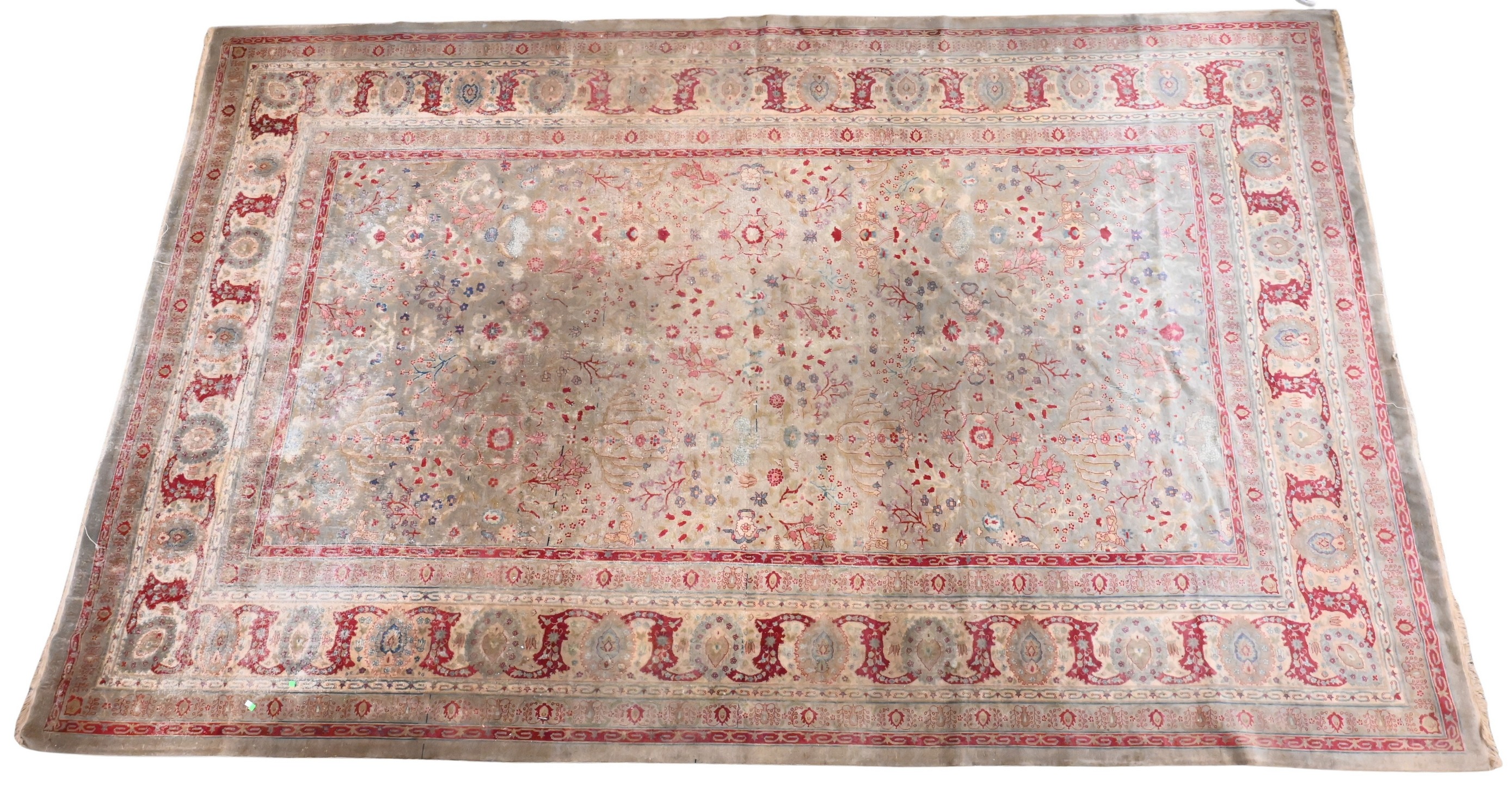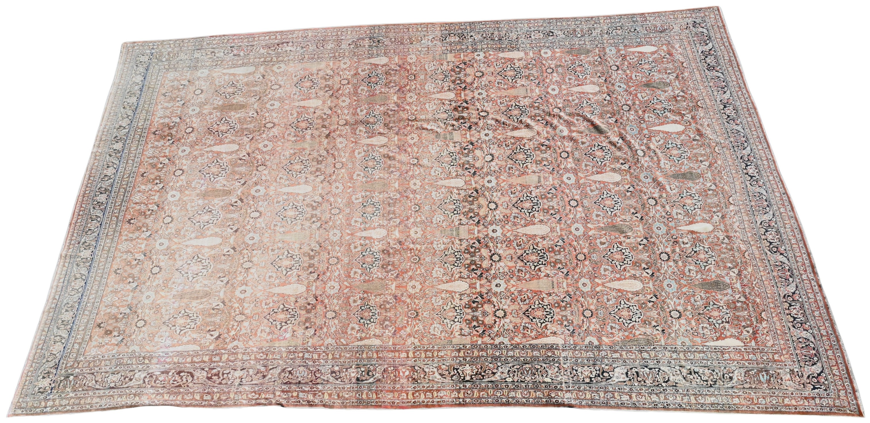 A large Persian Tabriz carpet woven with an allover floral field in shades of rust, ivory, cream, and black, framed by multiple floral and geometric borders.