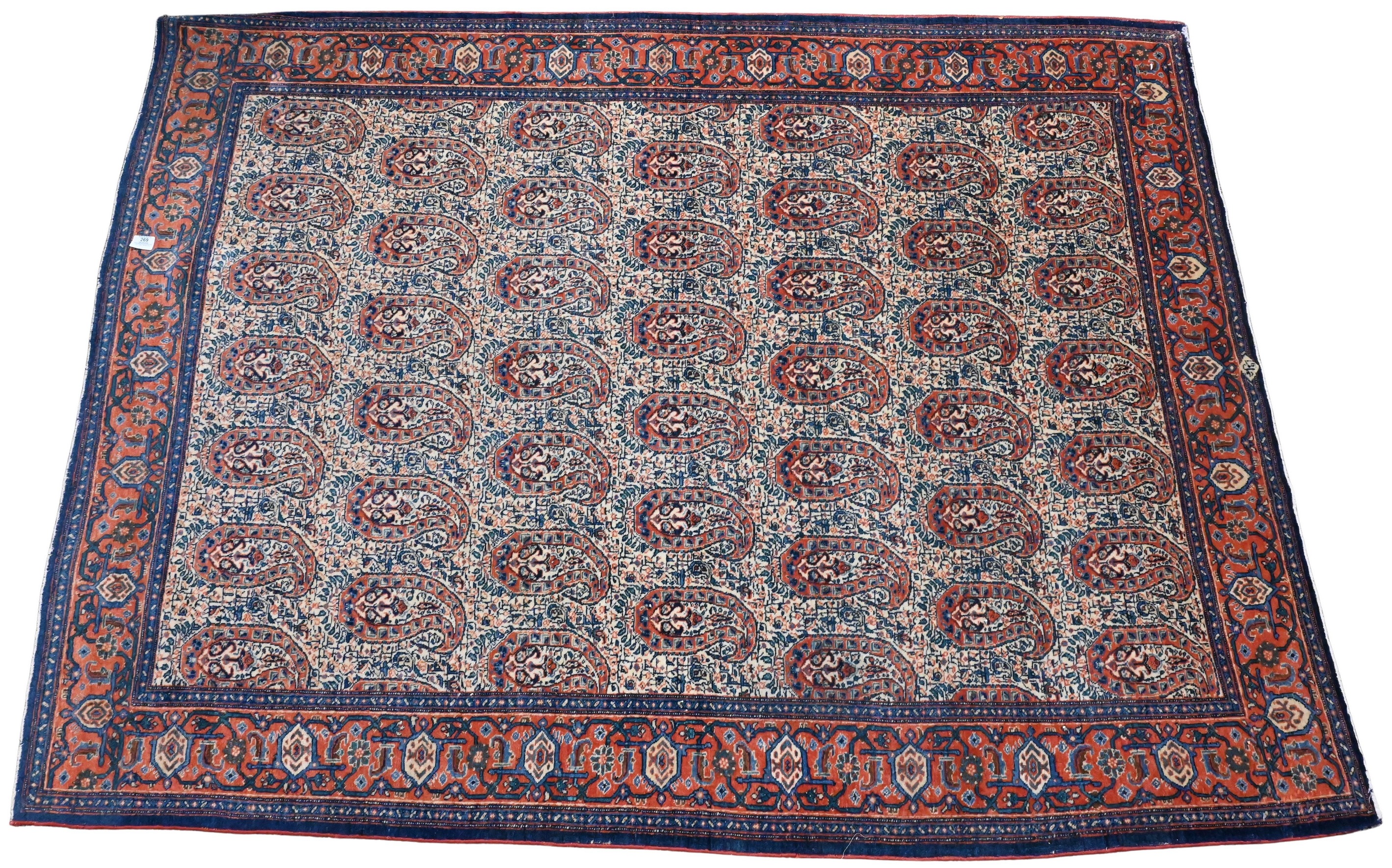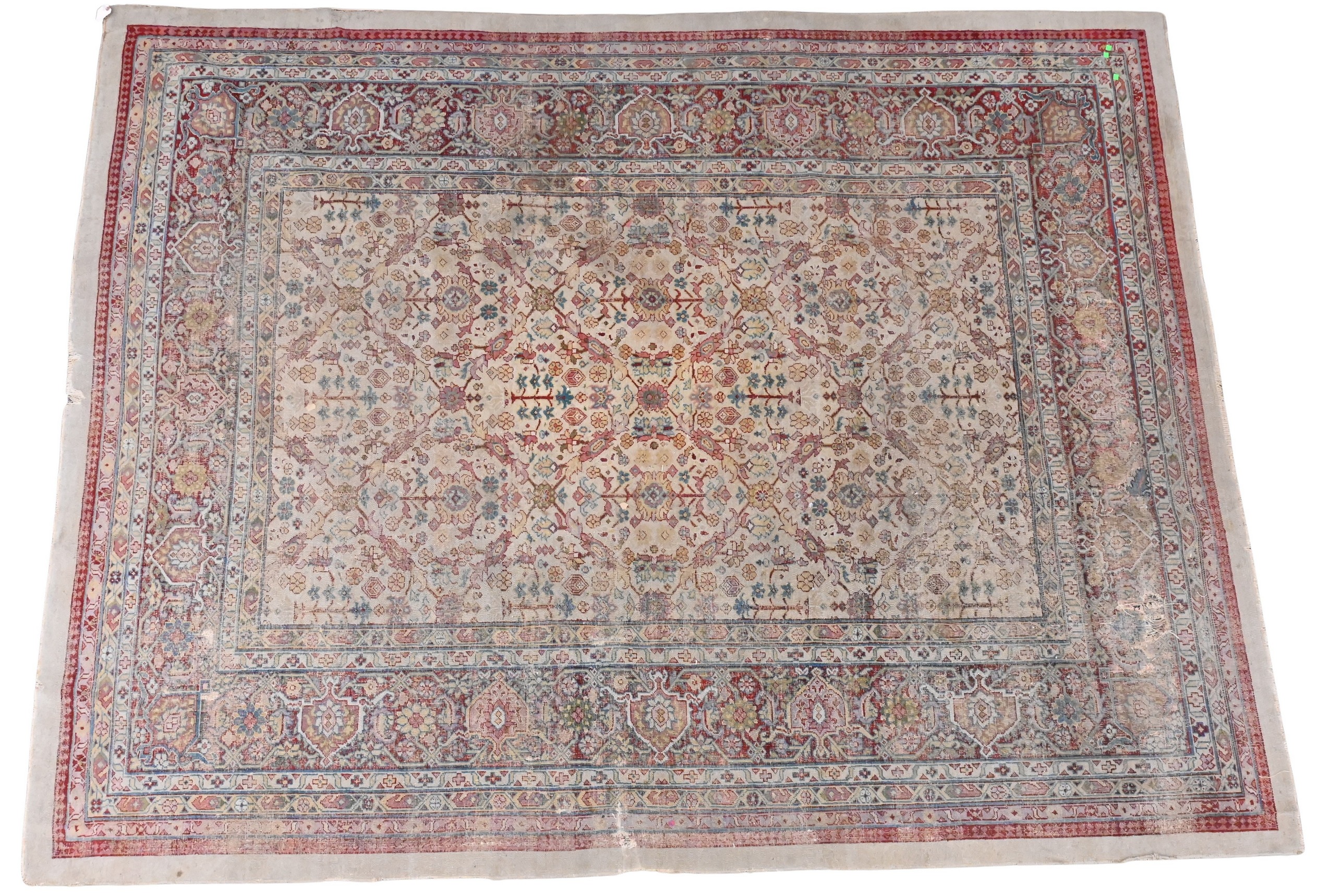 A Persian-style wool carpet with an ivory ground and repeating floral motifs within a contrasting border. Traditional palette of rust-red, cream, and muted greens.