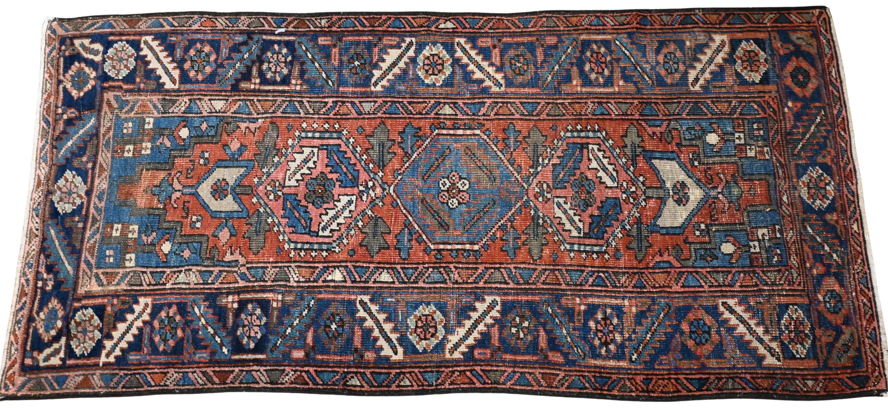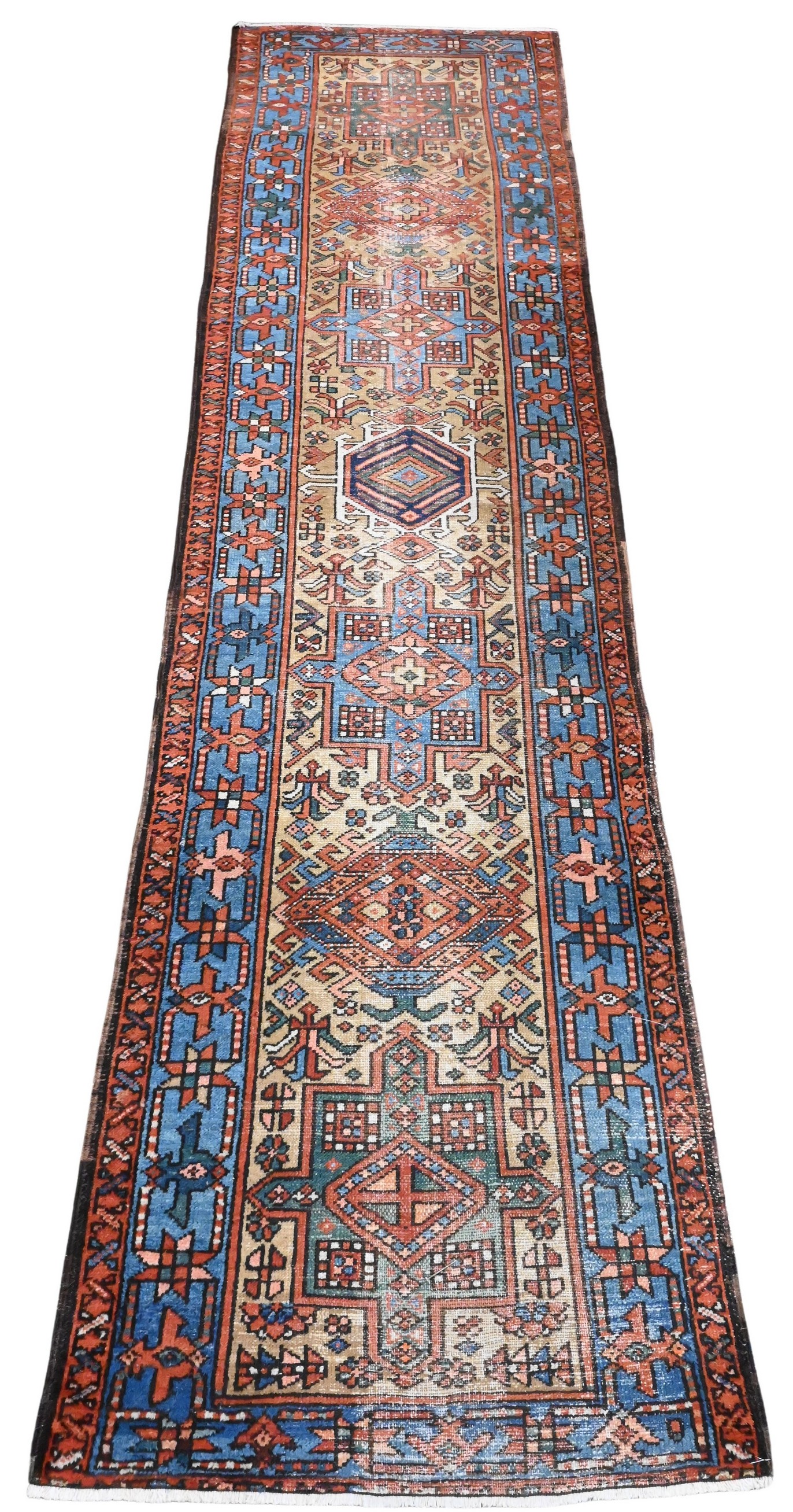A Persian Karaja runner, the gold ground with geometric medallions in rust, blue, and green, framed within multiple guard borders, the main border in blue with latch-hook motifs.