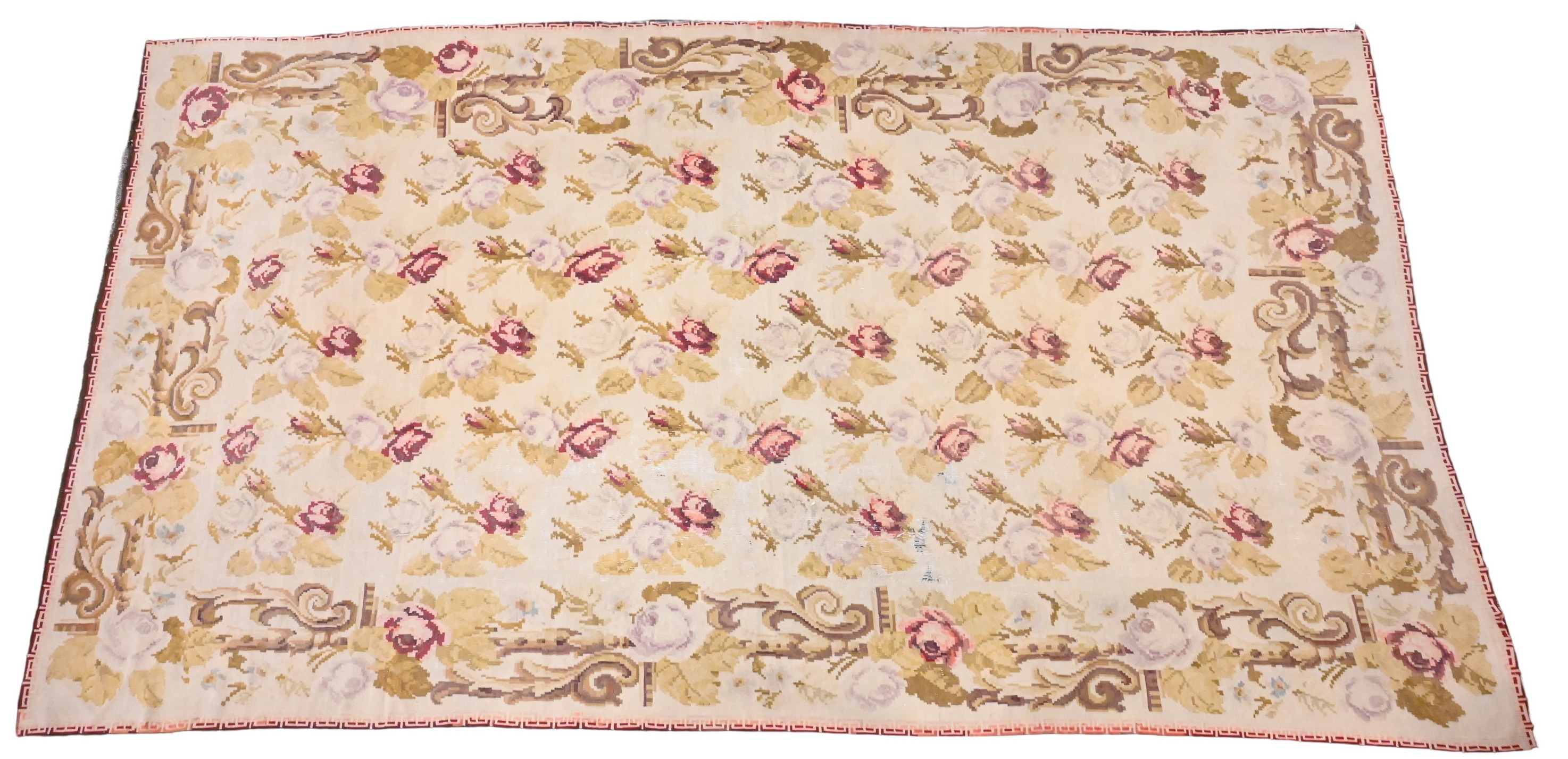 possibly Karabag kilim, with a cream ground decorated with a scrolling foliate border and an allover design of scattered rose and floral sprays in soft pinks, reds, greens, and golds. Framed with a Greek key outer border