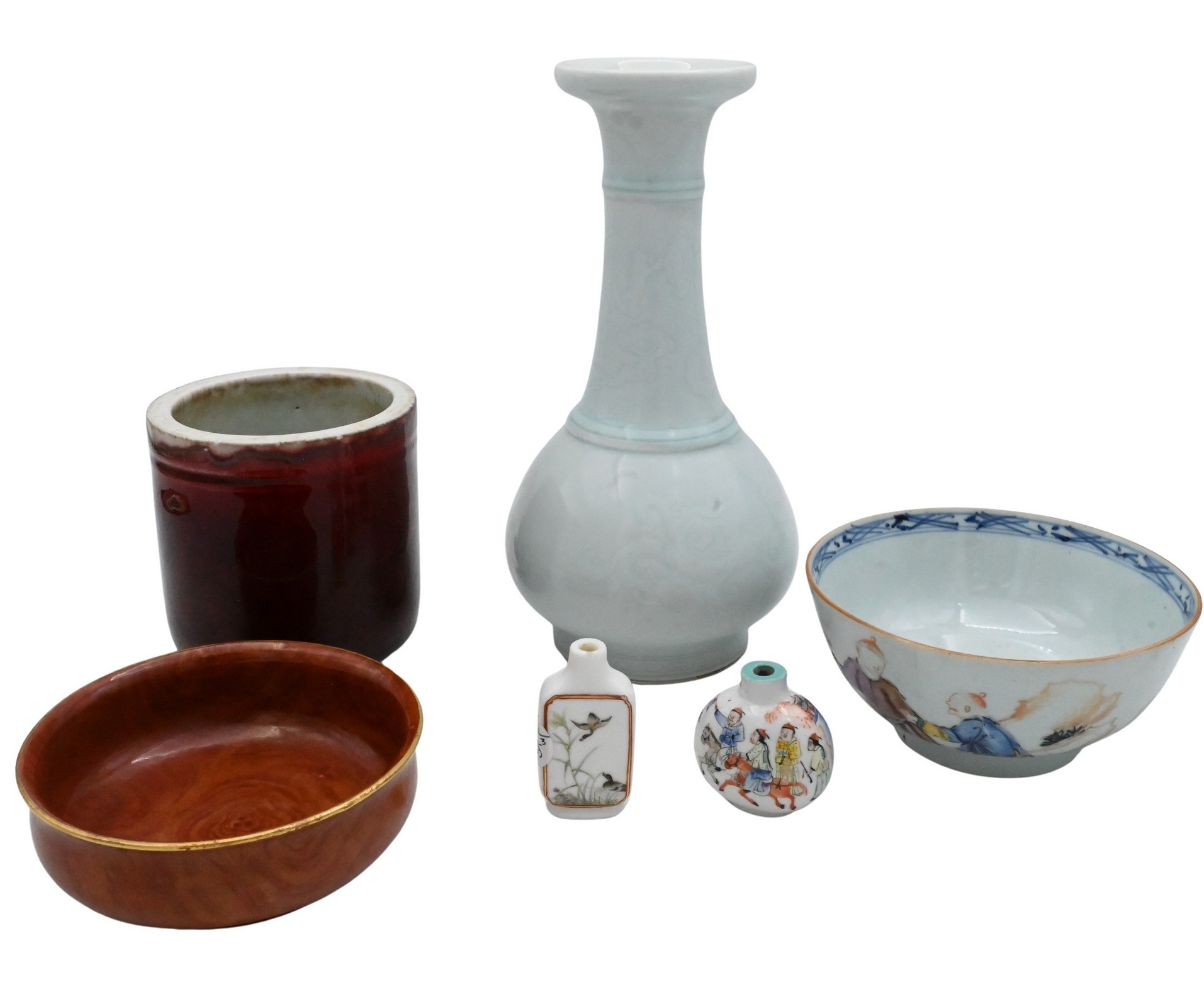 Comprising a tall celadon-glazed vase with molded decoration, a copper-red glazed brush pot, a blue and white bowl, an iron-red glazed bowl, together with two porcelain snuff bottles—one painted with figural scene, the other with floral decoration.