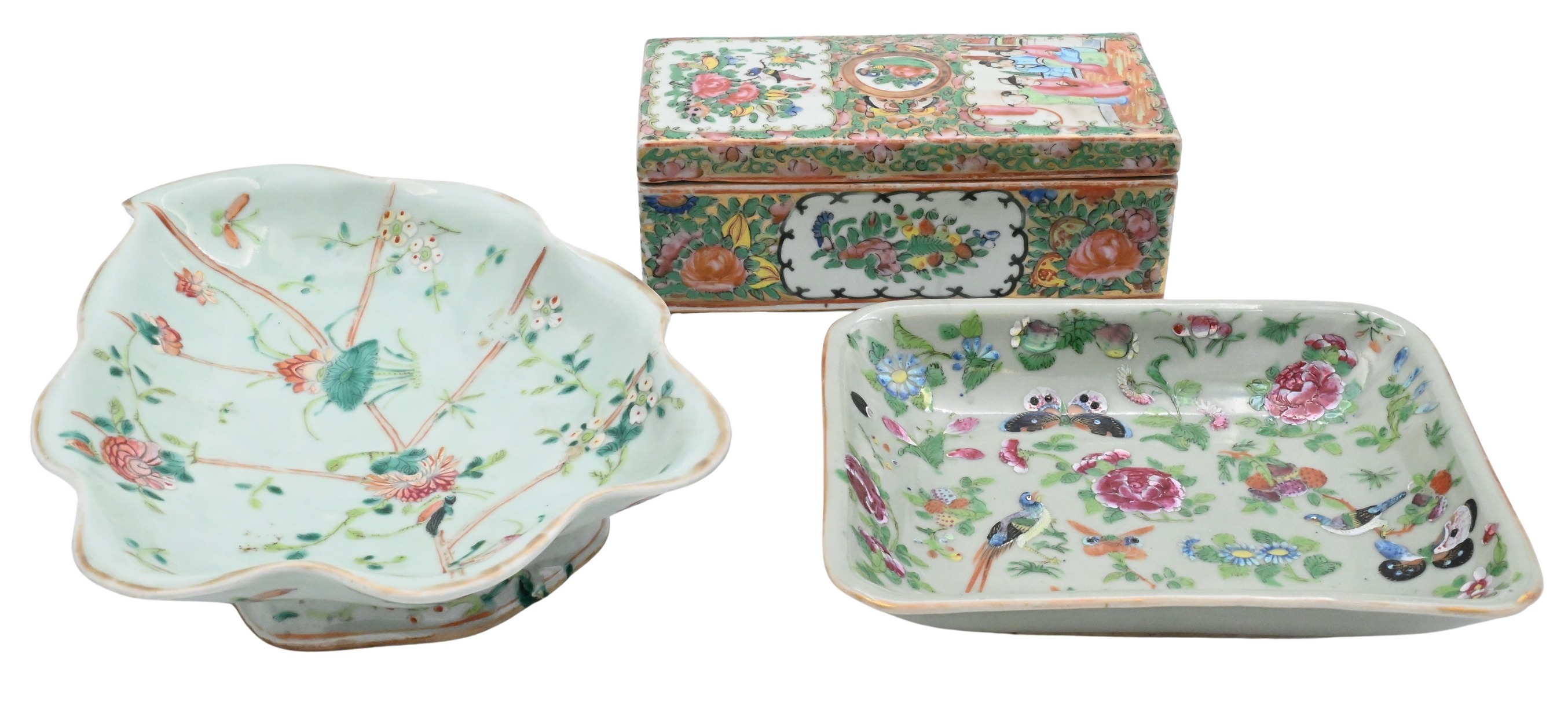 to include a leaf-shaped dish enameled with floral sprays and insects, bearing an iron-red Guangxu mark to the base, together with a rectangular dish decorated with peonies, birds, and butterflies amid foliage, all on a celadon glaze ground, along with rose medallion porcelain lidded scholars box