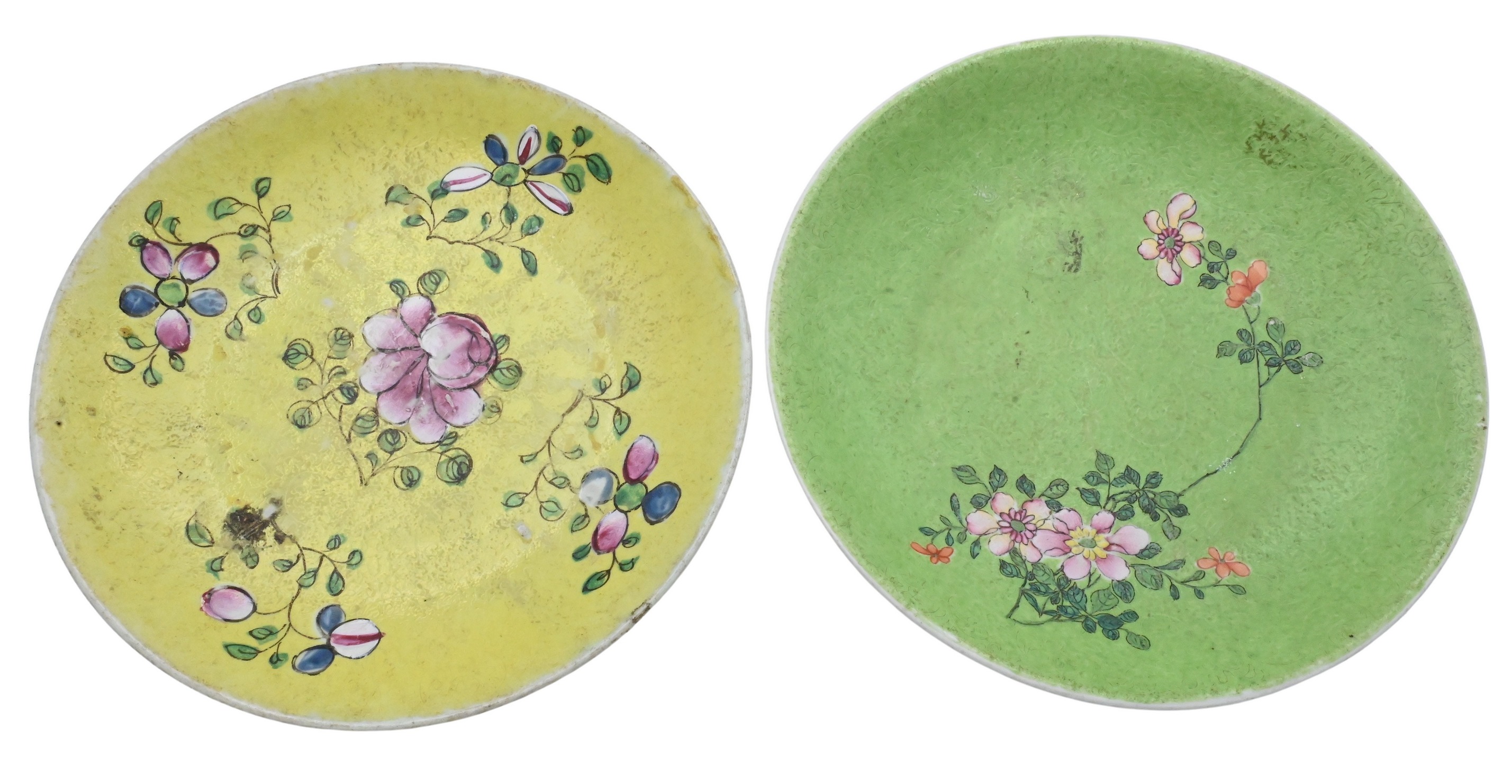 Each circular dish decorated in overglaze enamels with blossoming floral sprays on brightly enameled and sgraffito ground, one in lime green and the other in yellow green, the reverse with iron-red bamboo sprays
