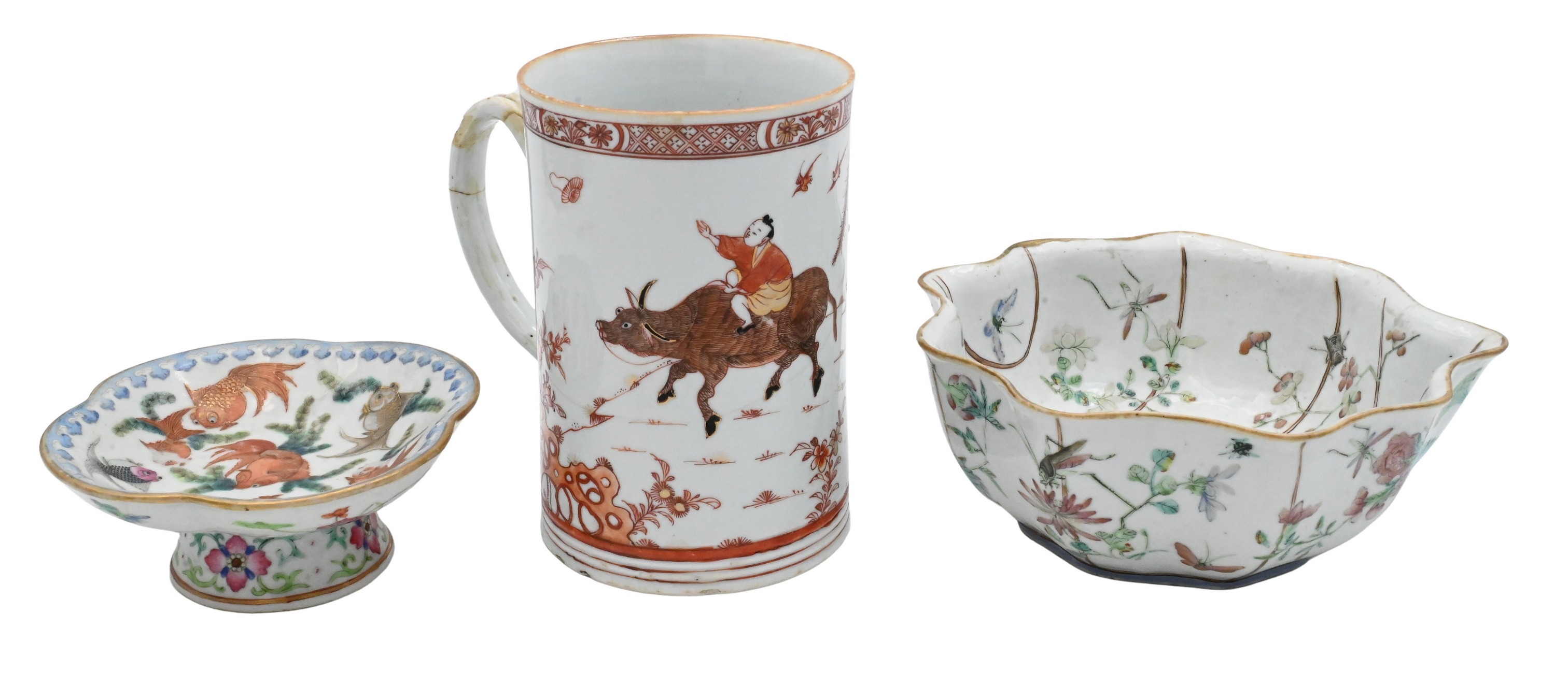 Including a tall export tankard decorated in iron-red with boy and ox scene, height 6 inches.; a famille rose organic lobed bowl with floral sprays and insects, and a famille rose foliate dish with goldfish and seaweed decoration