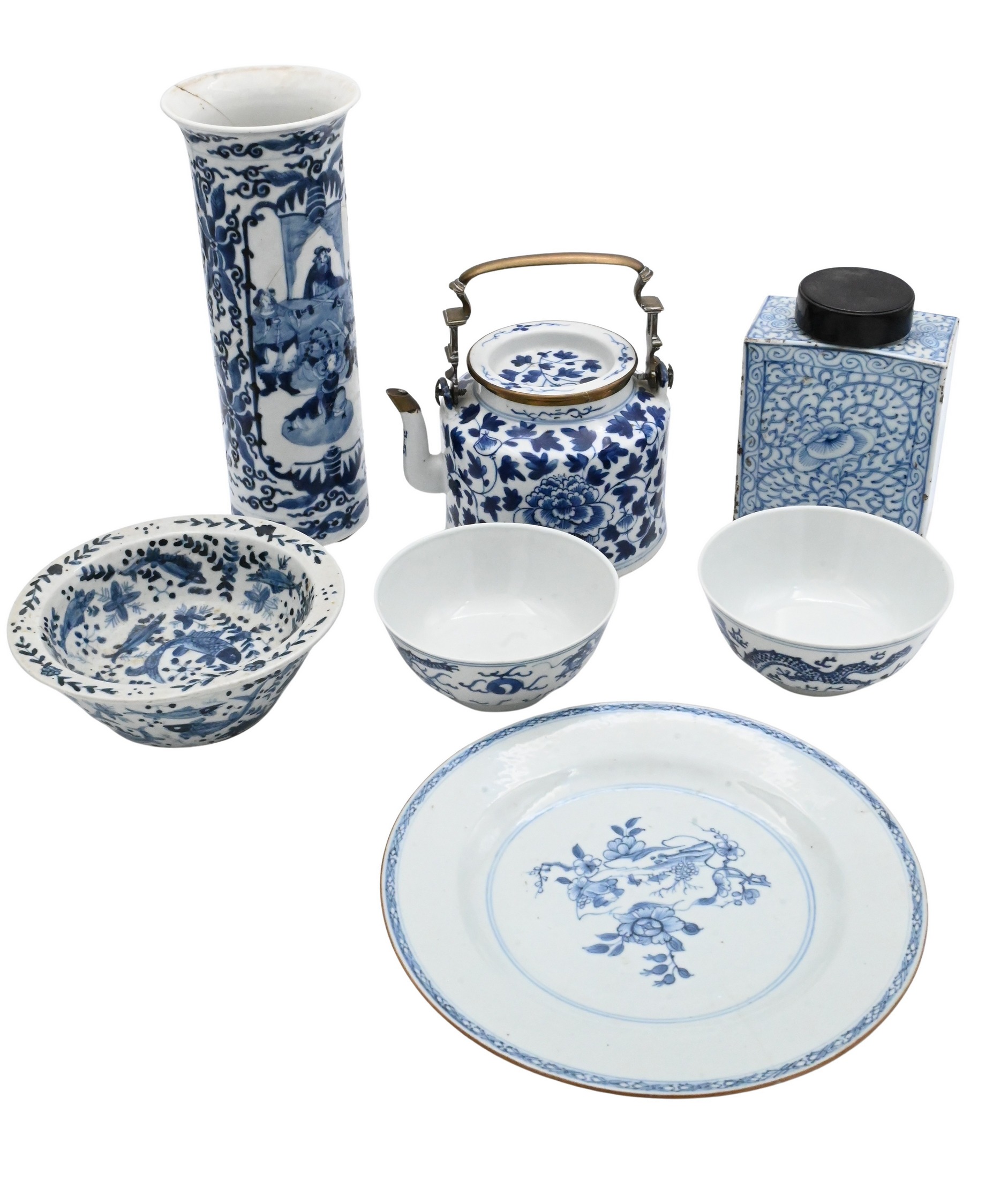 to include a cylindrical trumpet vase decorated with a figural interior scene; square tea caddy with floral scrolls, teapot with brass handle and floral decoration, two small bowls with floral sprays, bowl with fish and seaweed decoration and a plate with central floral sprays