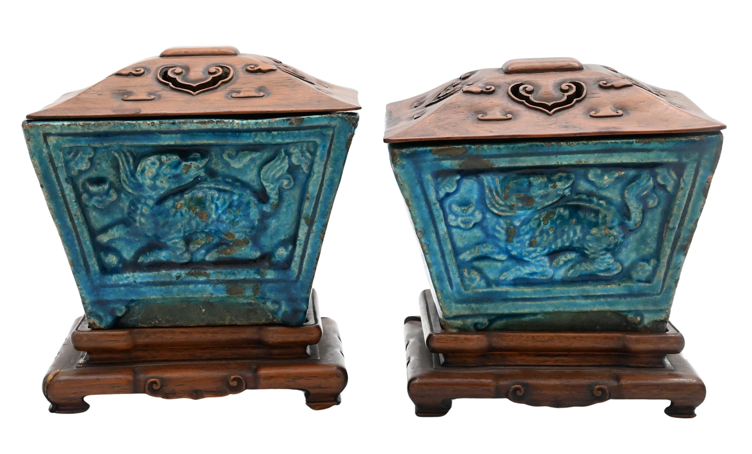 Pair of Small Chinese Stoneware Rectangular Censers / Boxes