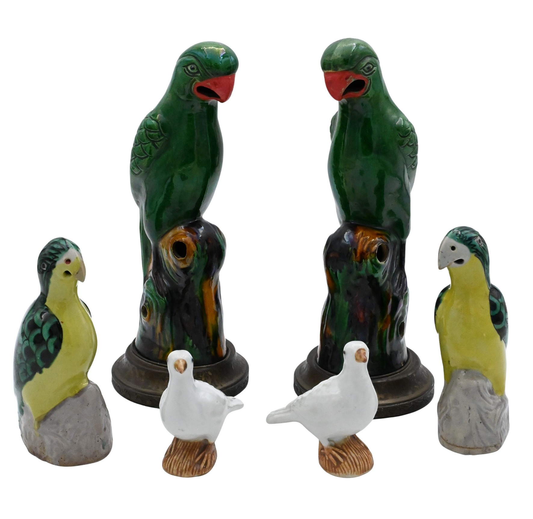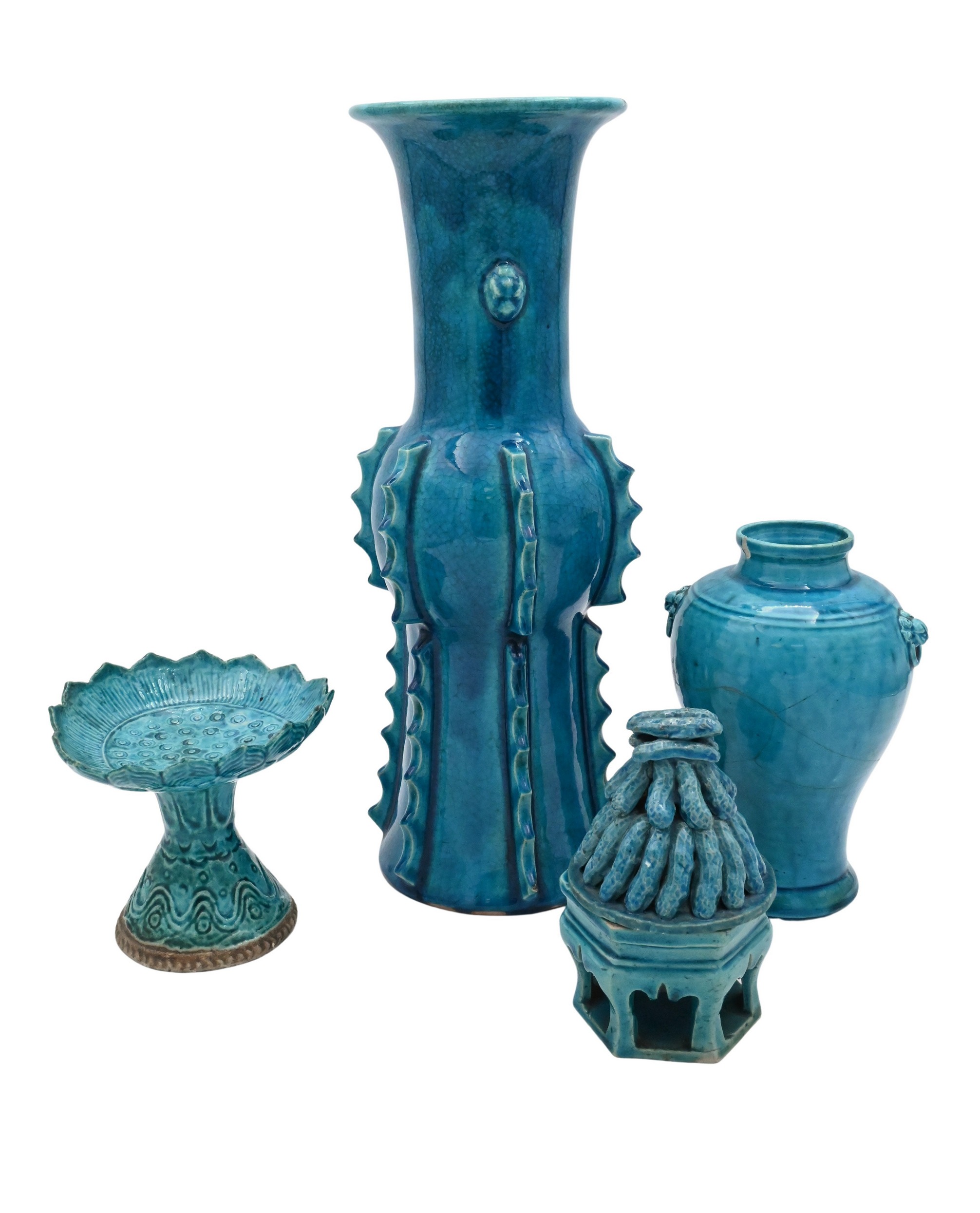 Including a tall faceted vase with raised vertical ribs and medallion motifs, a hexagonal covered censer with pierced base and pine-cone finial, a baluster-form jar with applied mask handles, and a pedestal dish with scalloped rim and incised wave decoration. Each covered in a brilliant turquoise crackle glaze, Qing Dynasty or Later