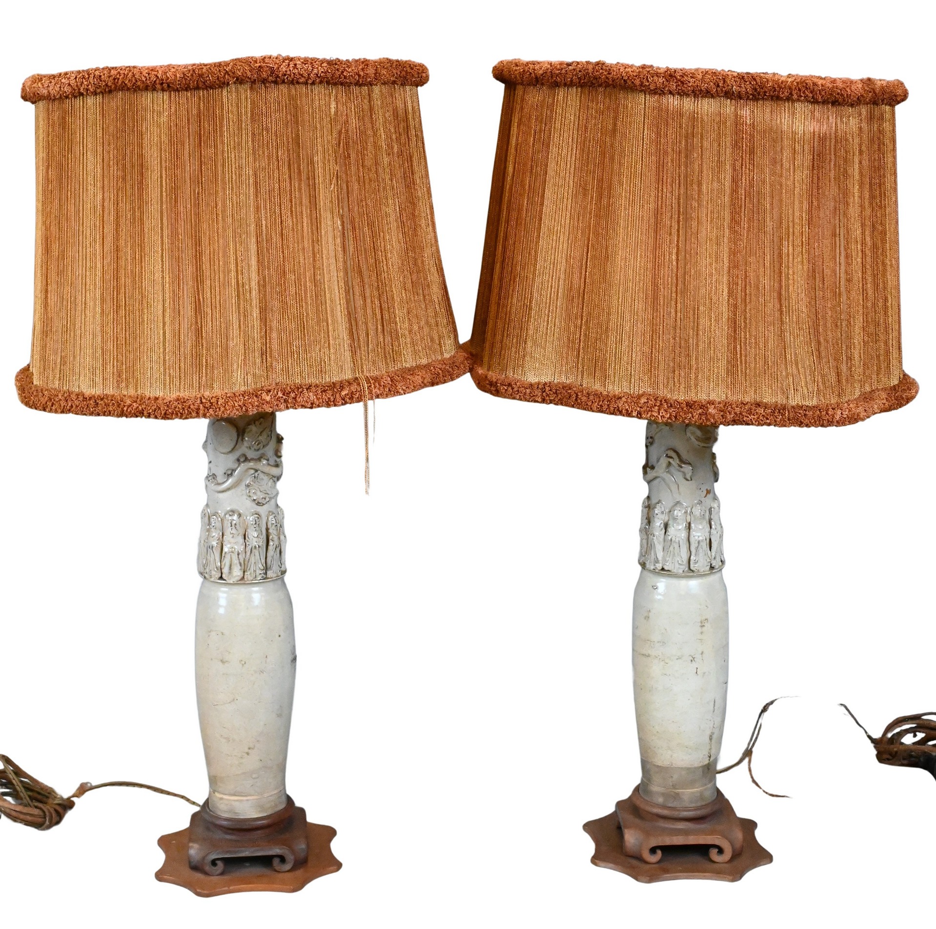 A pair of Chinese stoneware funerary vases, the cylindrical bodies with applied entwined serpents above a band of standing figures in relief, each mounted on a wooden base and fitted as a table lamp with unusual custom shades.