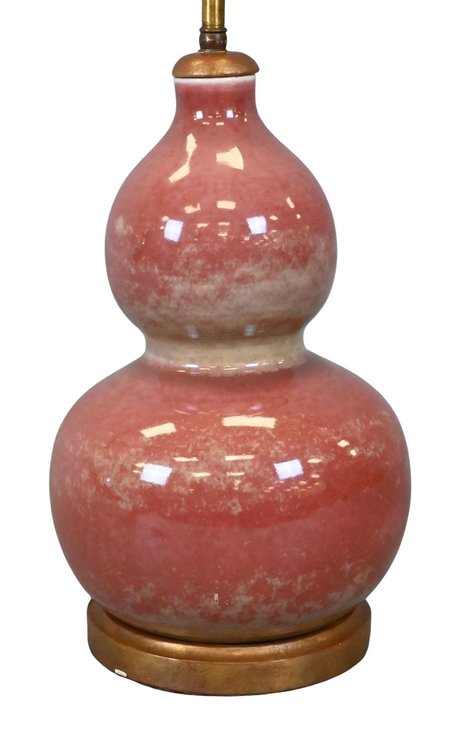porcelain double-gourd vase covered in a rich oxblood glaze with variegated shading and lighter speckling, mounted on a brass base and fitted as a lamp