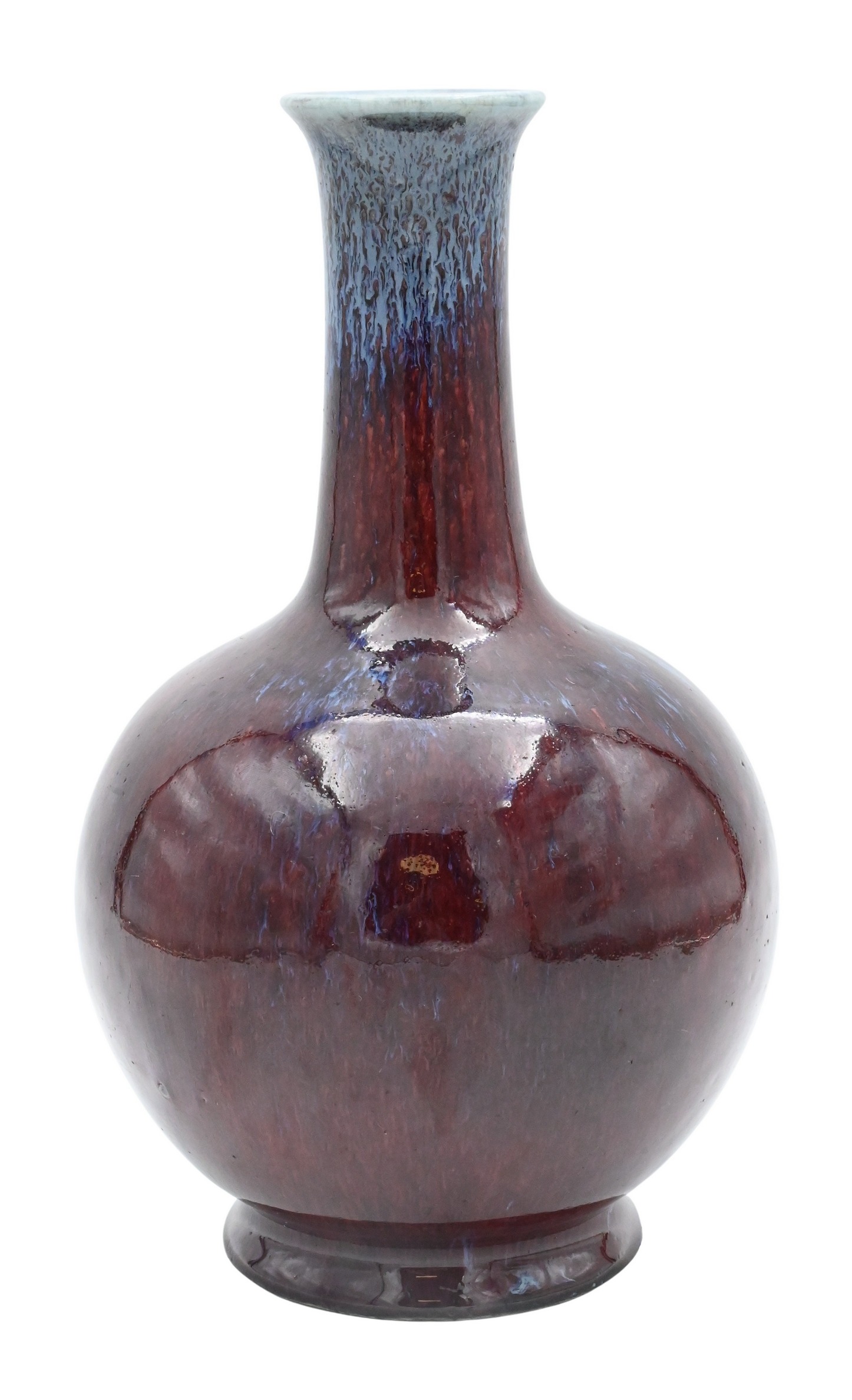 in ox blood red or Yao Bian glaze, lavender streaking, impressed Yongzheng mark along with Marchant label on underside “Yongzheng 1723-1735”