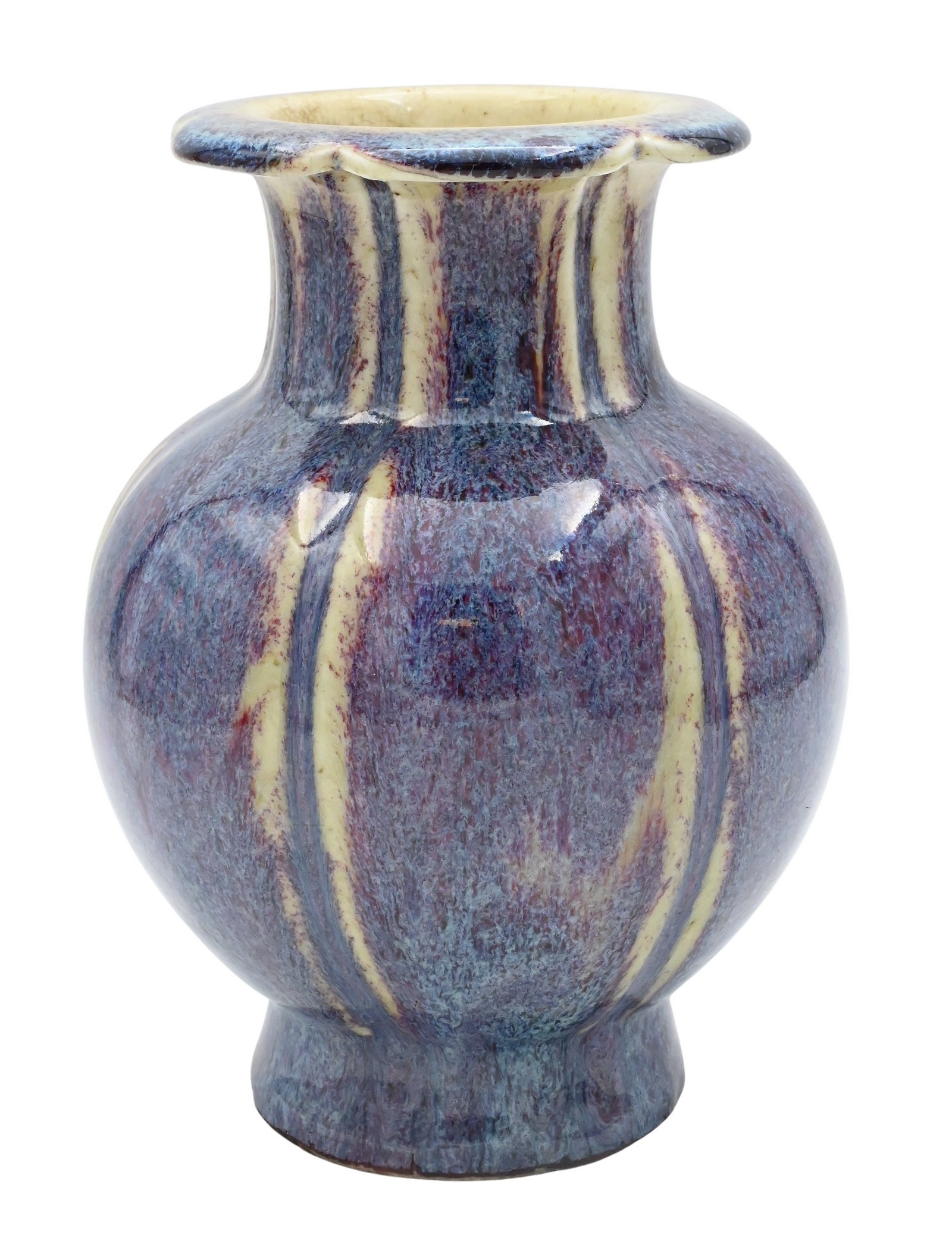 A porcelain vase of bulbous form with flaring rim, covered overall in a flambé glaze of streaked purple and red with vertical cream and lavender striations.