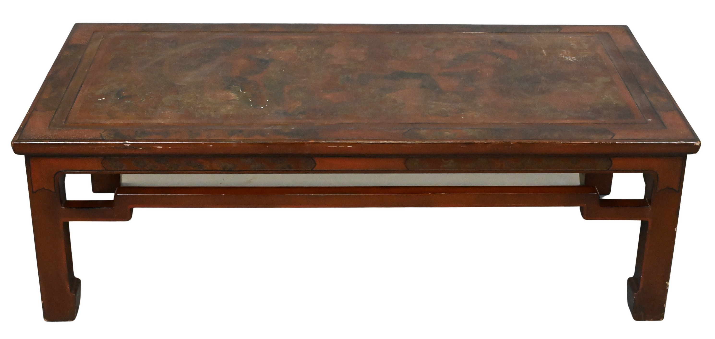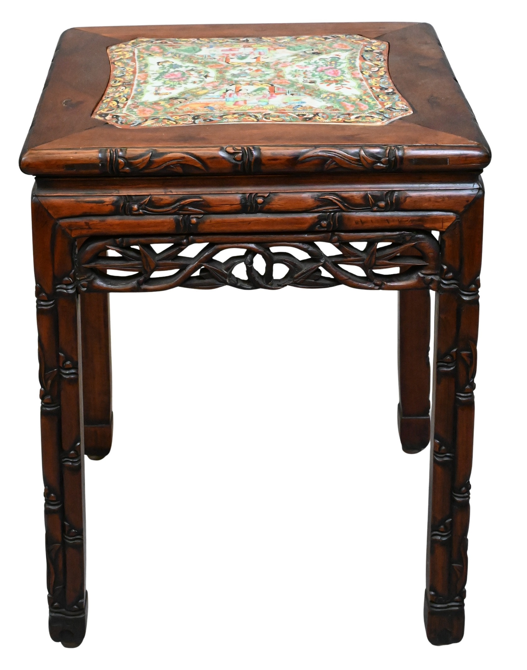 A Chinese hardwood table carved in bamboo motif, the square top inset with a finely painted rose medallion porcelain panel depicting court figures, birds, butterflies, and floral reserves within a gilt and polychrome border.