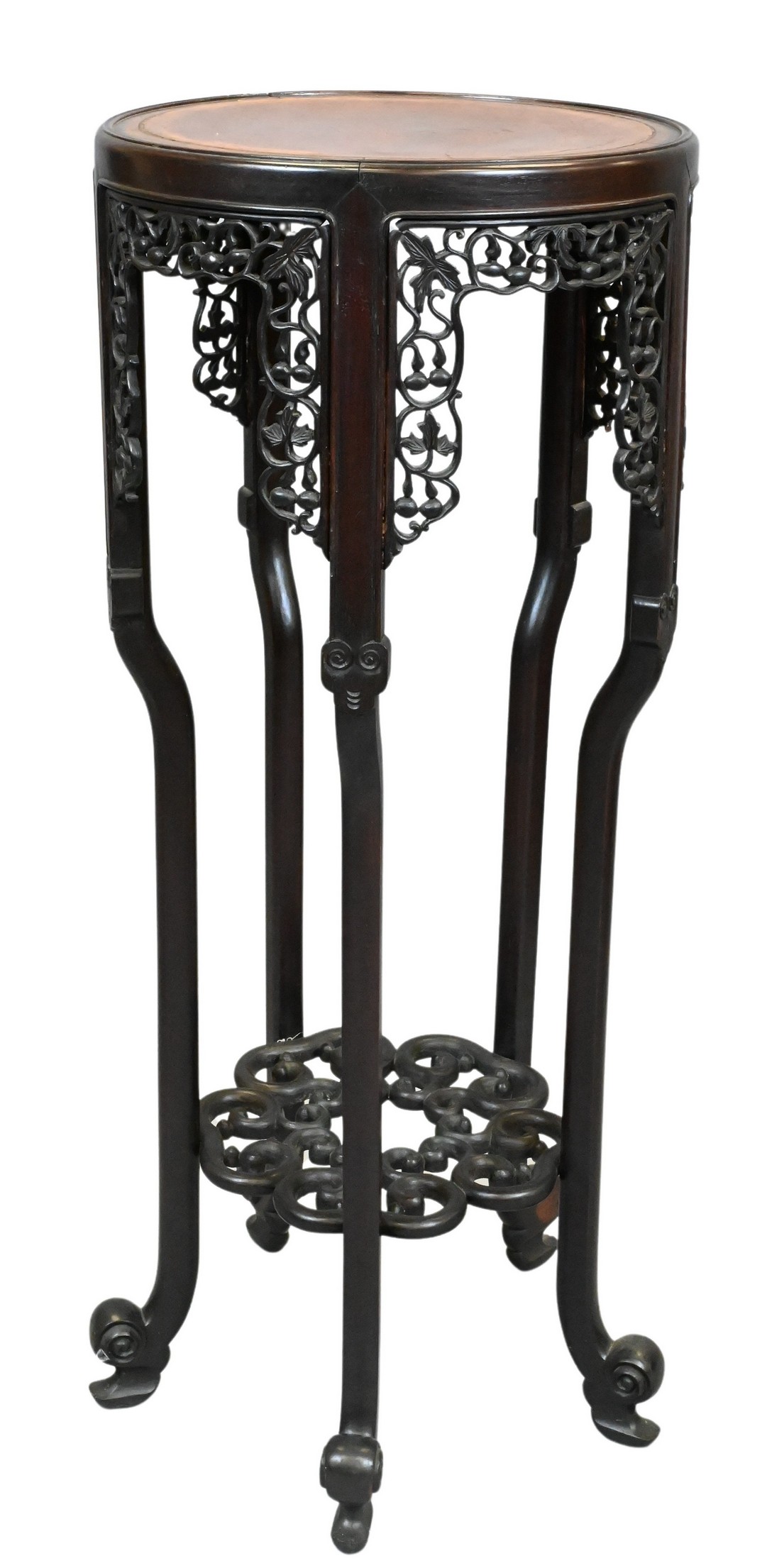 A tall hardwood plant stand with circular top and openwork apron carved in scrolling cloud motifs, supported on four slender cabriole legs with incised detailing, joined by a pierced circular stretcher, terminating in curled feet.