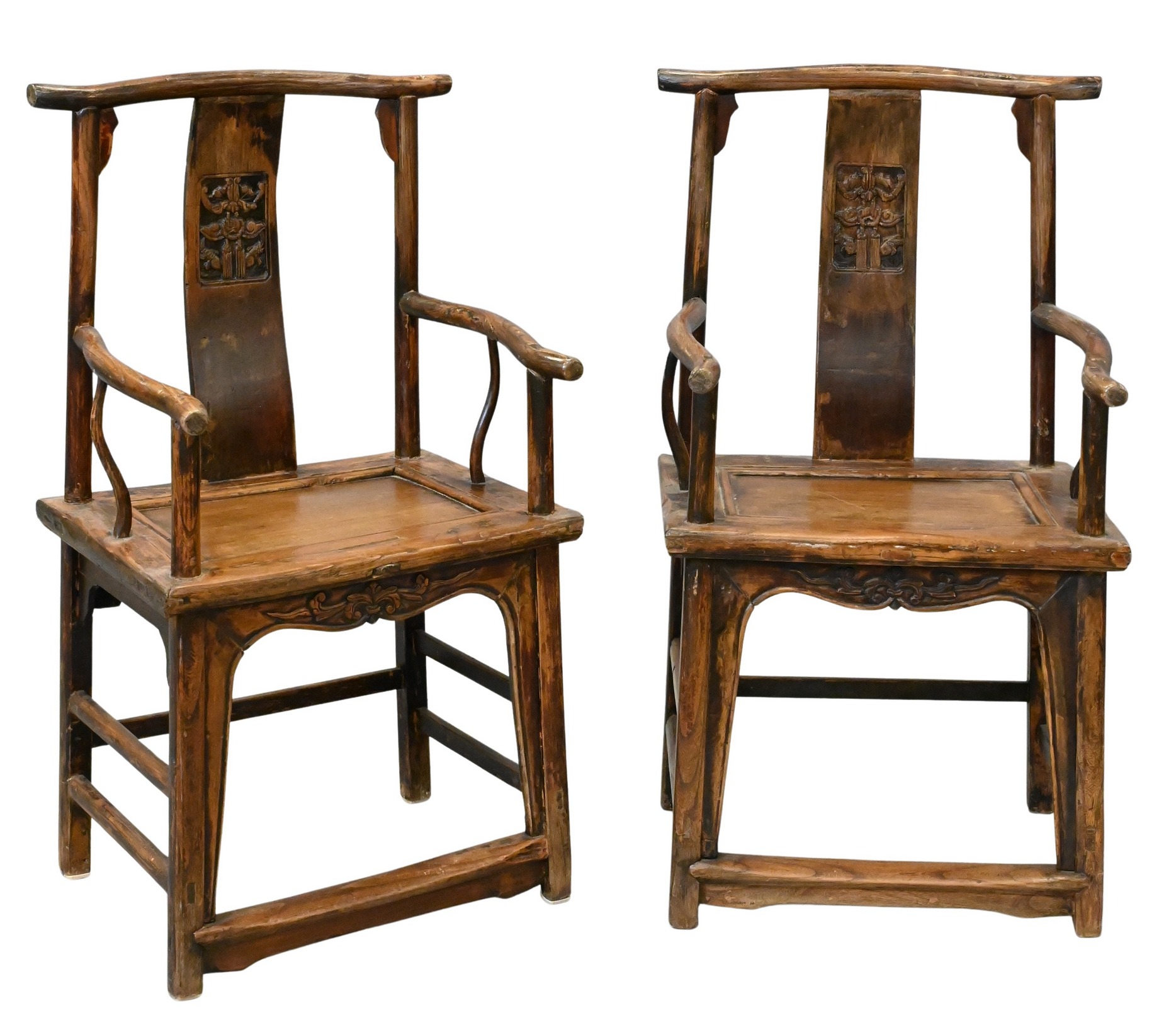 Each with shaped crest rail above a central back splat carved with a shou longevity medallion, flanked by out-swept arms over a rectangular seat, supported on square legs joined by low stretchers. Exhibiting a warm, worn surface with age-expected wear and shrinkage.