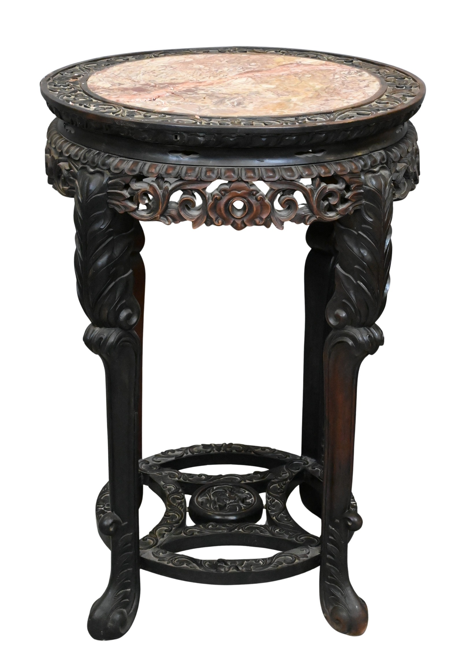 A finely carved hardwood stand with circular marble inset top, the shaped apron with openwork floral and foliate carvings, raised on four cabriole legs joined by a circular pierced stretcher, terminating in scrolled feet.