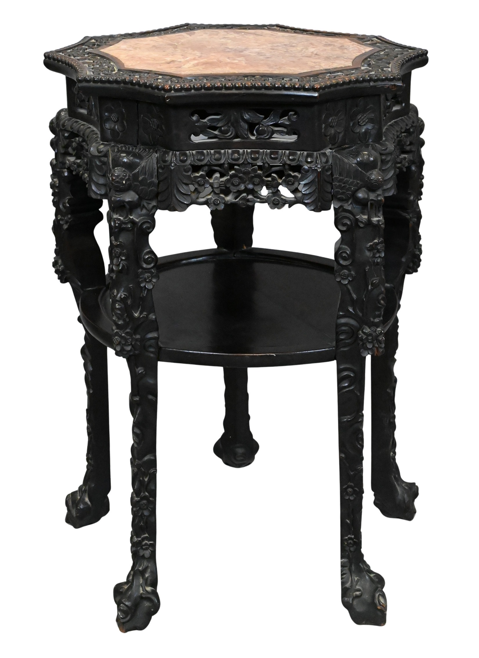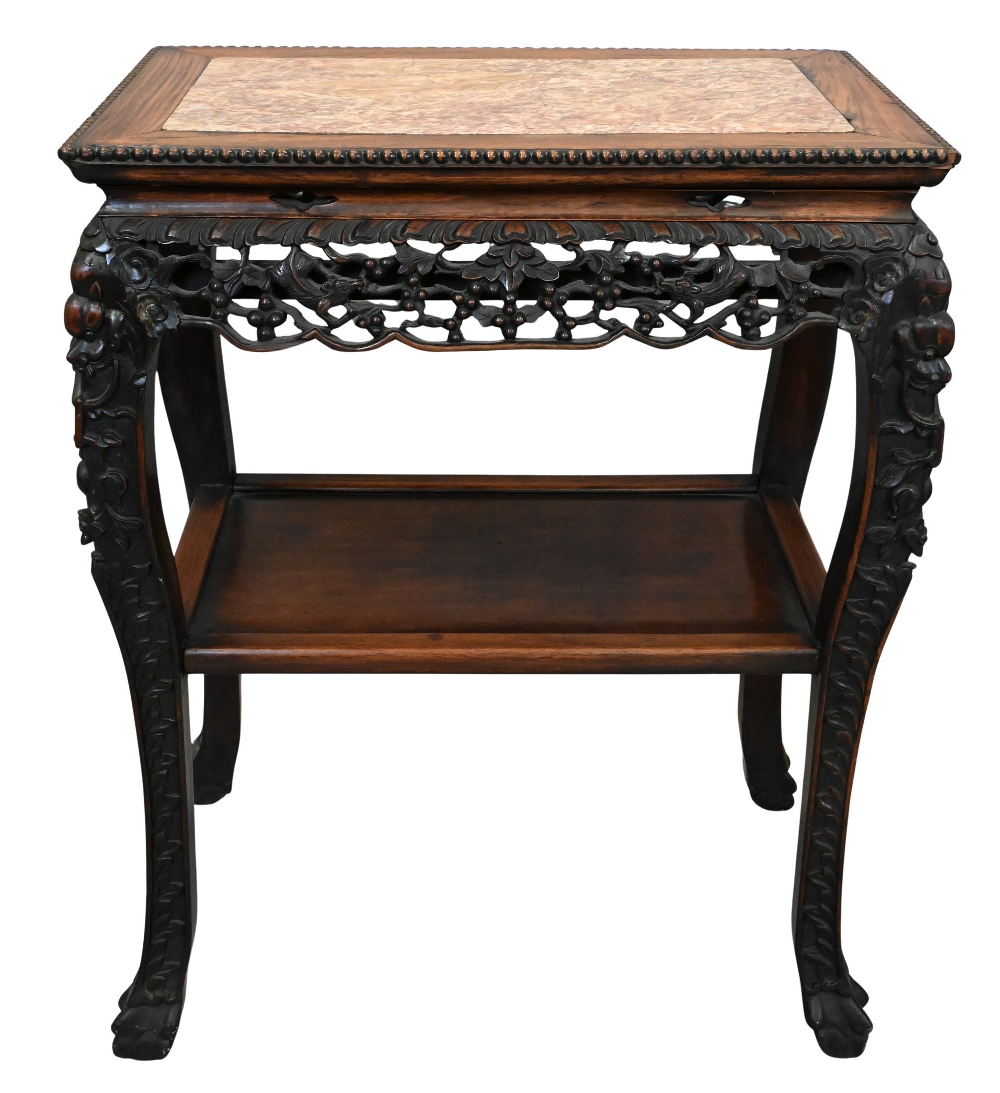 An elaborately carved hardwood stand with inset marble top of shaped form, the pierced apron richly decorated with floral and foliate motifs, raised on four cabriole legs carved with mythical beast masks and trailing vines, joined by a lower circular shelf, terminating in claw-and-ball feet.