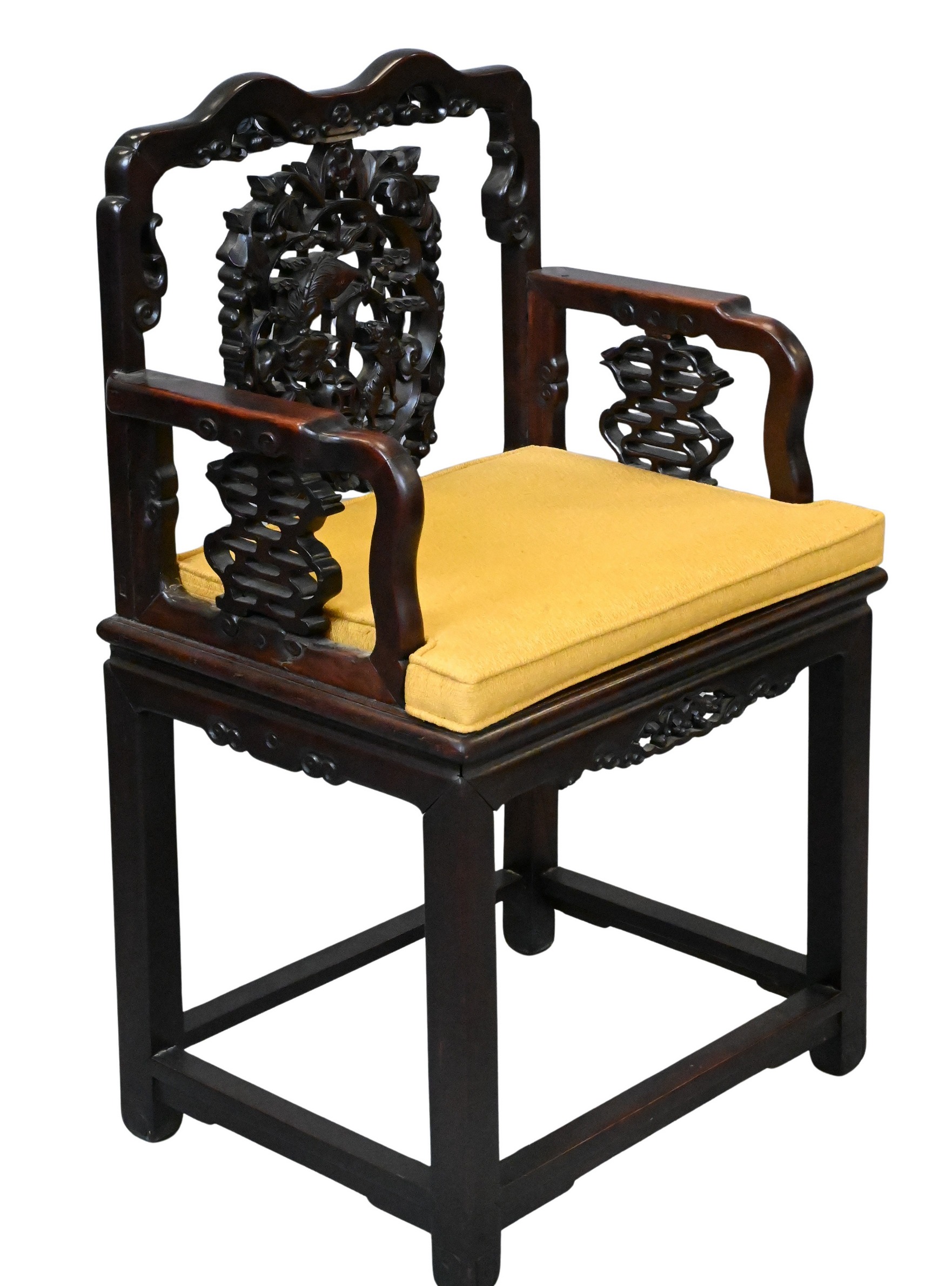 A Chinese carved hardwood armchair, the pierced back splat elaborately carved with a central bird among flowering branches, framed by scrolling foliage, the arms similarly carved with floral designs. Solid seat over an apron with foliate carving, raised on square legs joined by stretchers.