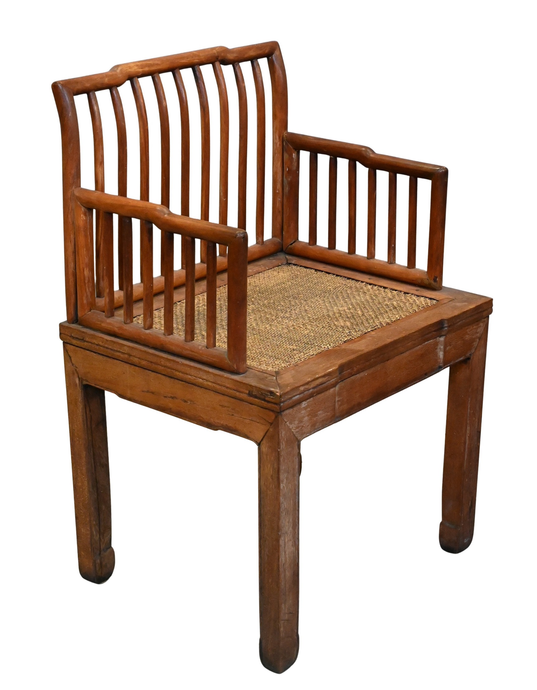 The rectangular back and arms with vertical spindle supports, over a square frame seat fitted with woven panel, raised on plain straight legs.