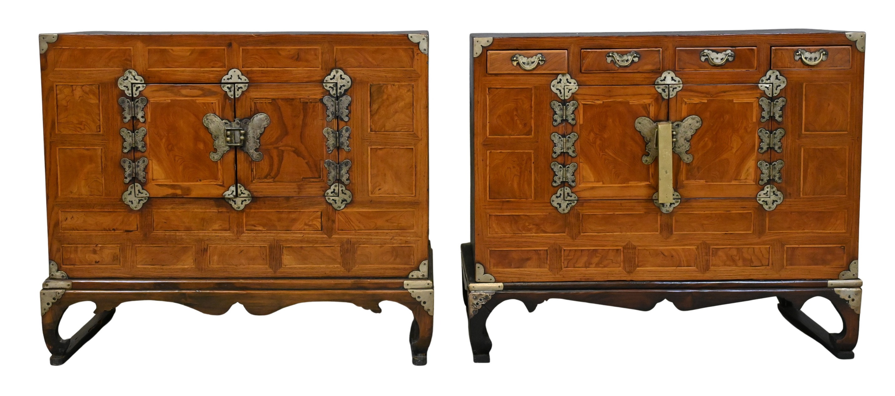 A pair of Korean chests fitted with brass butterfly-form lock plates and decorative hinges, over cases with three small drawers above two paneled doors, raised on bracket feet. height 26 inches, top 15″ x 30 1/4″ Condition: surface wear, minor age cracks, and oxidation to brass consistent with age and use.