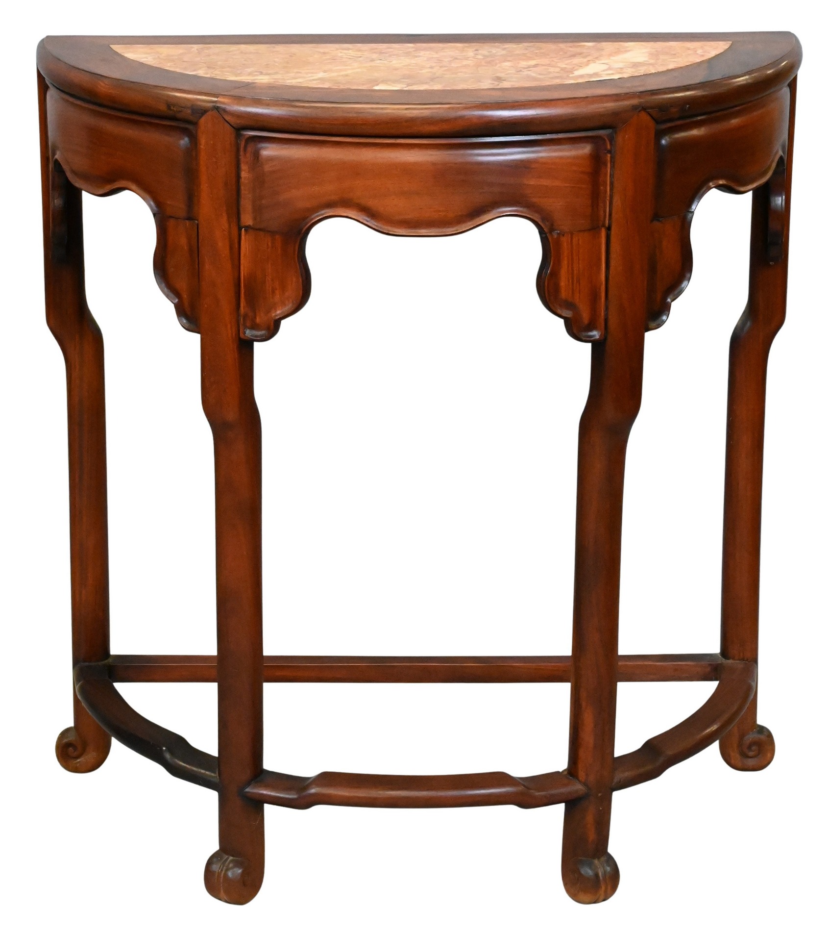 A demilune form stand with inset variegated pink marble top within a molded hardwood frame, the shaped apron over straight legs joined by a demilune stretcher base.