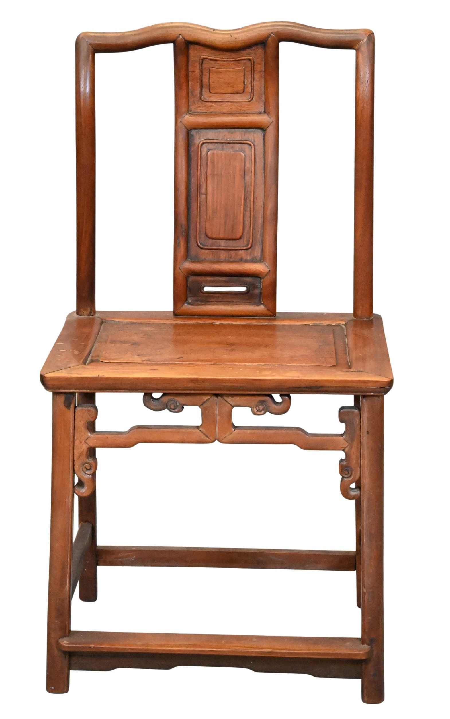 A Chinese hardwood official’s hat-back side chair, the shaped top rail over a rectangular back splat with relief-molded panels, above a solid seat. The apron carved with foliate scrolls and spandrels, raised on square legs joined by stretchers.