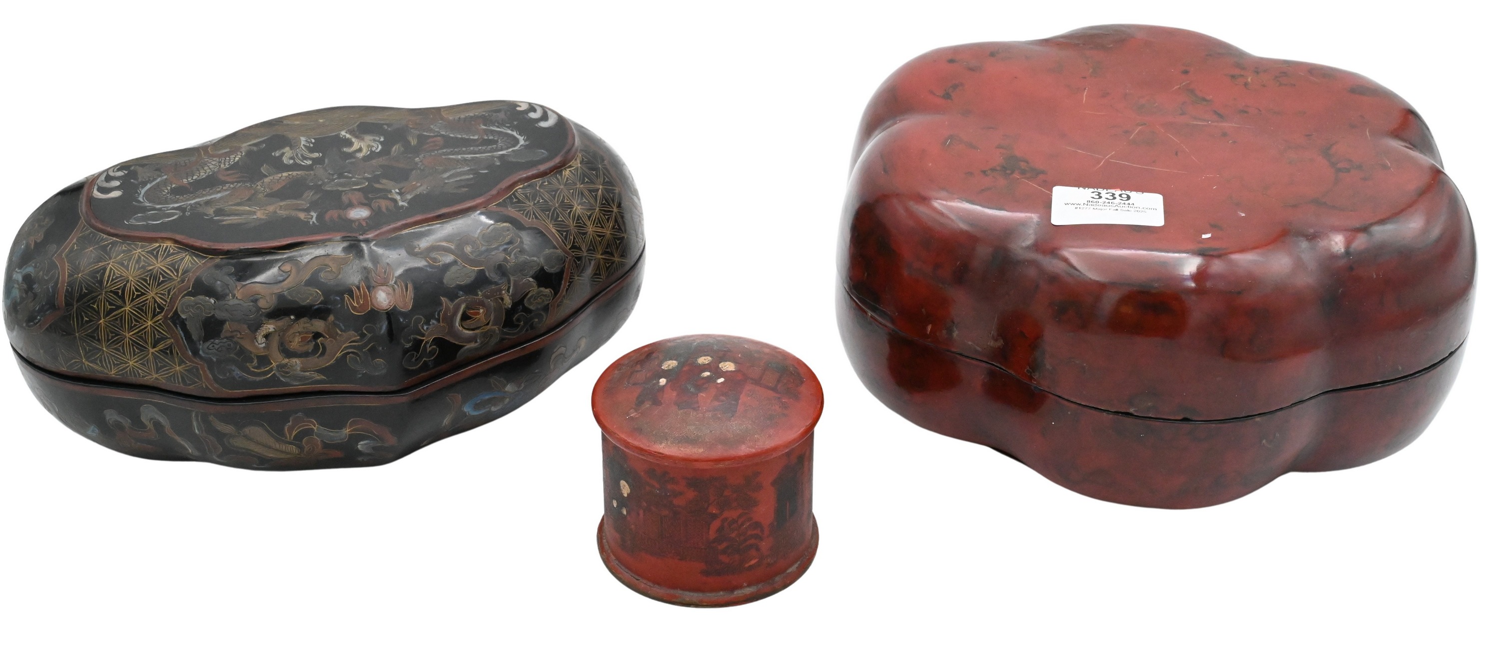 cinnabar lacquer box of flower form, black lacquered shaped box with gilt painted five claw dragons and birds along with small lacquered round box with figural motif