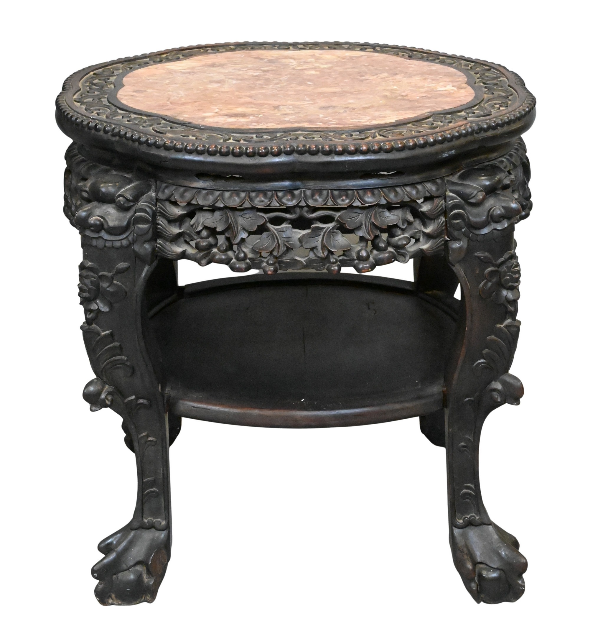 A circular hardwood stand with marble inset top, the apron deeply carved with floral and foliate designs, raised on four cabriole legs with mask and scroll carvings, joined by a circular shelf stretcher, ending in paw-form feet.