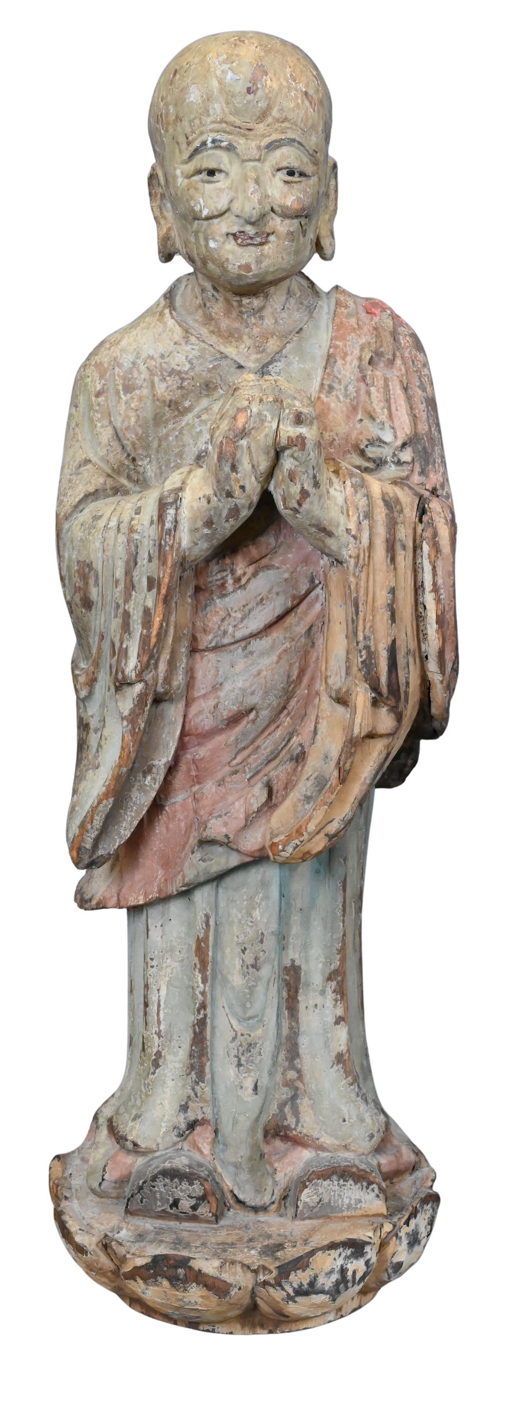 A carved wooden standing figure of a Buddhist monk, hands clasped in front, wearing layered robes with traces of original polychrome decoration, raised on a lotus base.