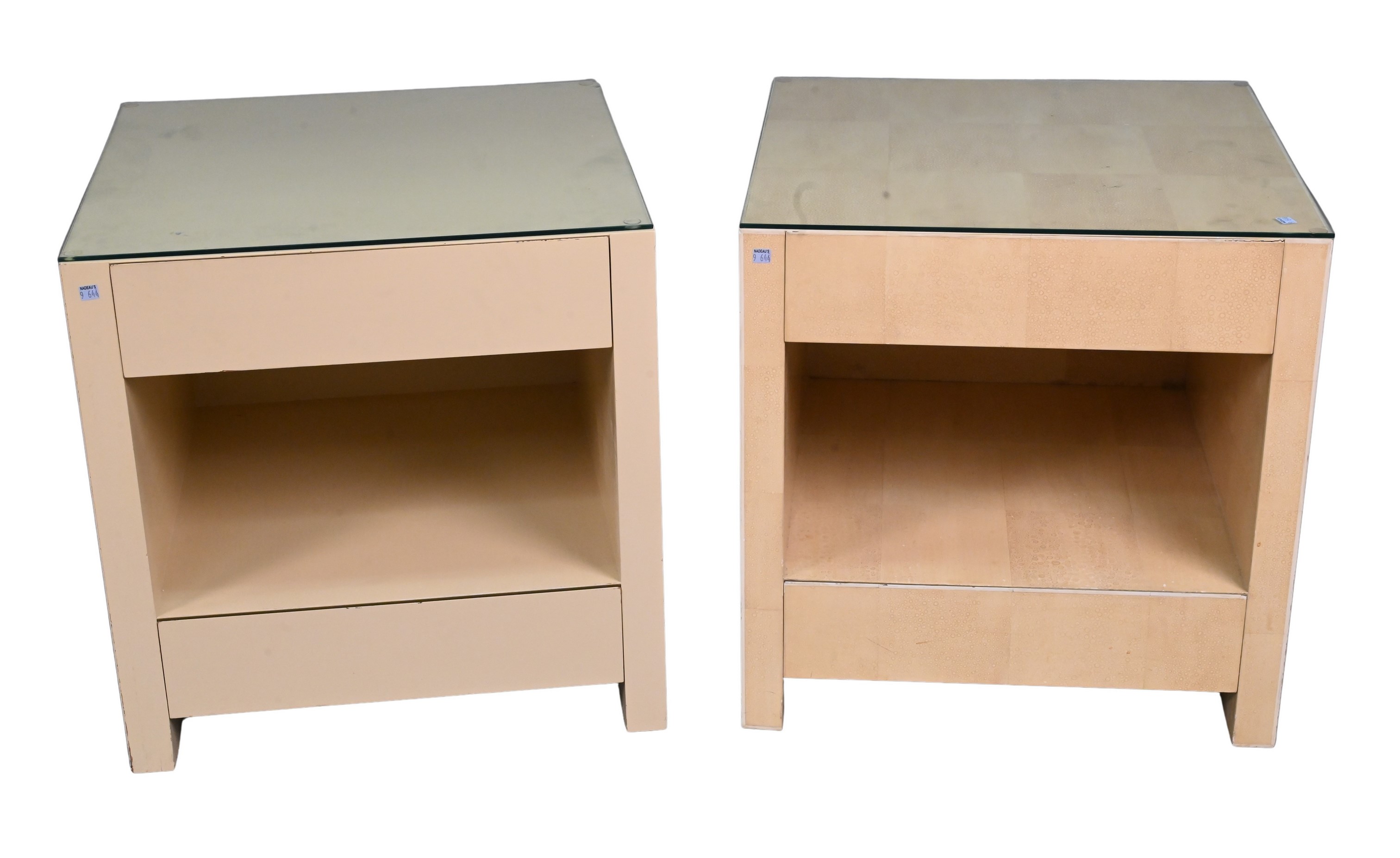 one white/ cream lacquer with single drawer, the other in faux shagreen lacquer with single drawer