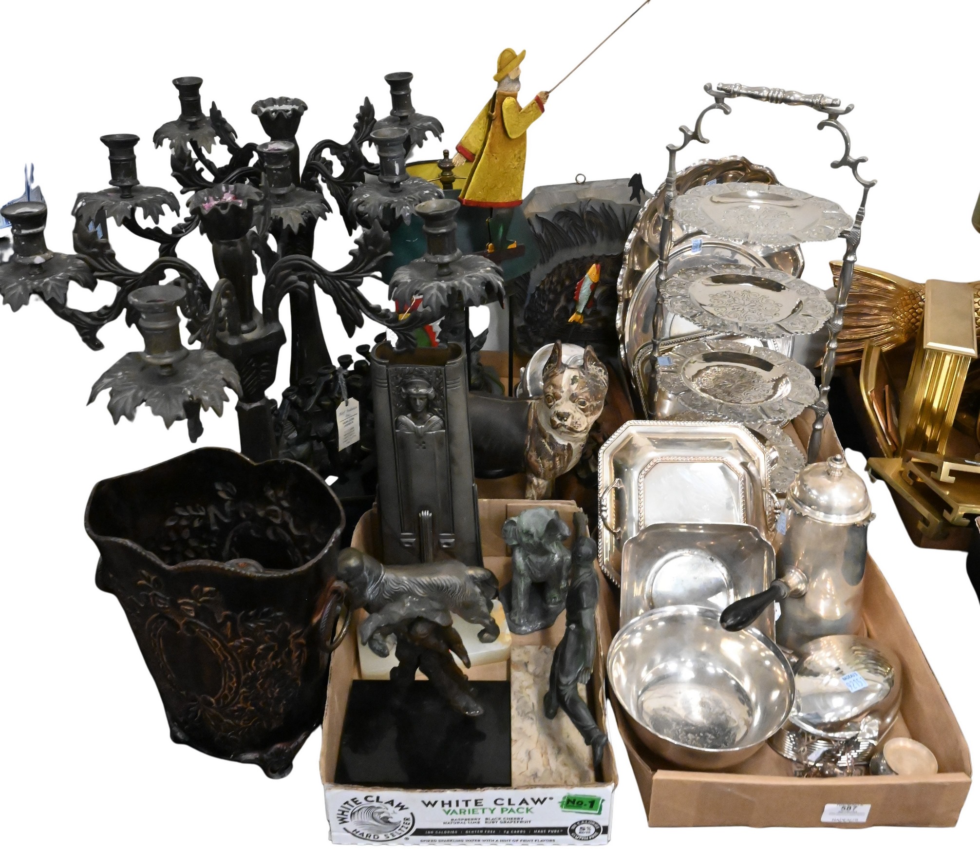 to include Boston terrier iron door step, tin cache pot, pair of metal candelabras, telegraph, folk art kinetic fisherman, along with silver plate dessert tray, kettle, platters etc…
