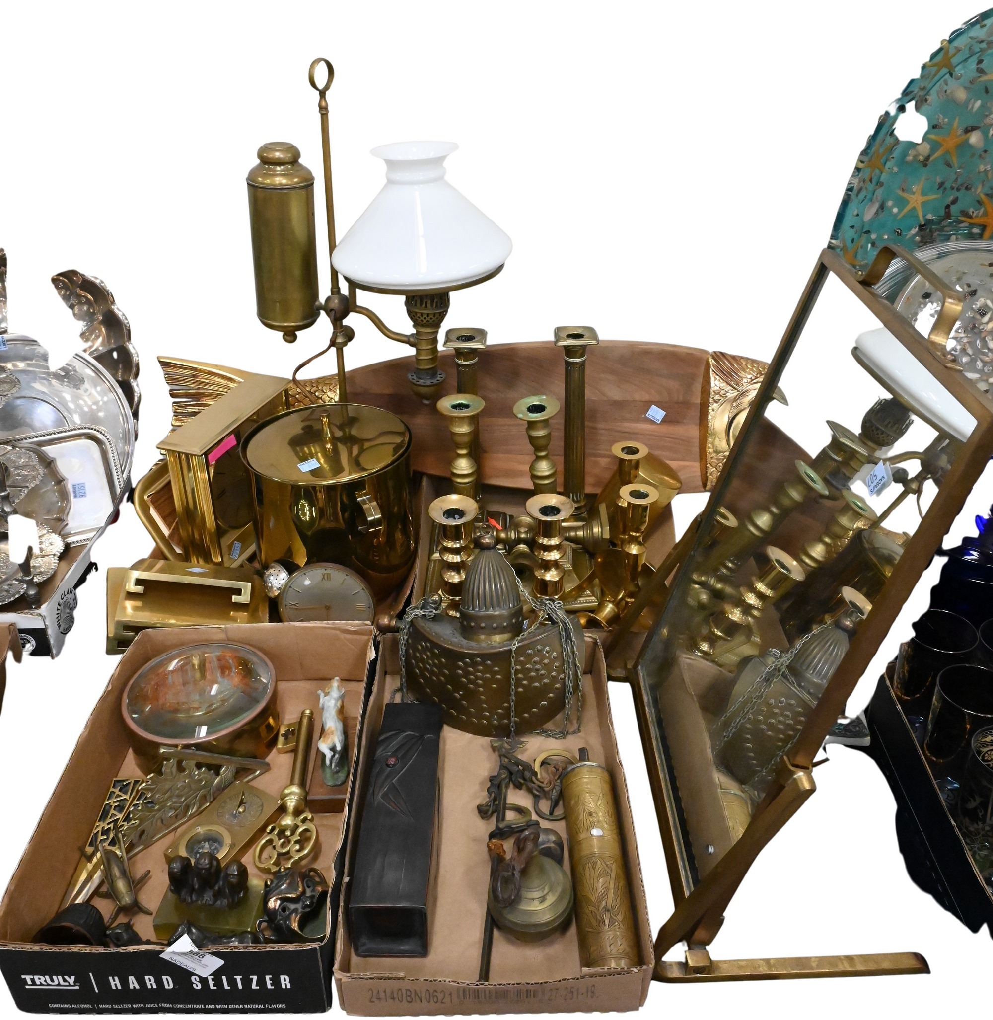 to include square vanity mirror, candlesticks, ice bucket, Bulova Quartz desk clock, Ottoman Islamic weight/scale, sundial and compass, large fish platter etc..