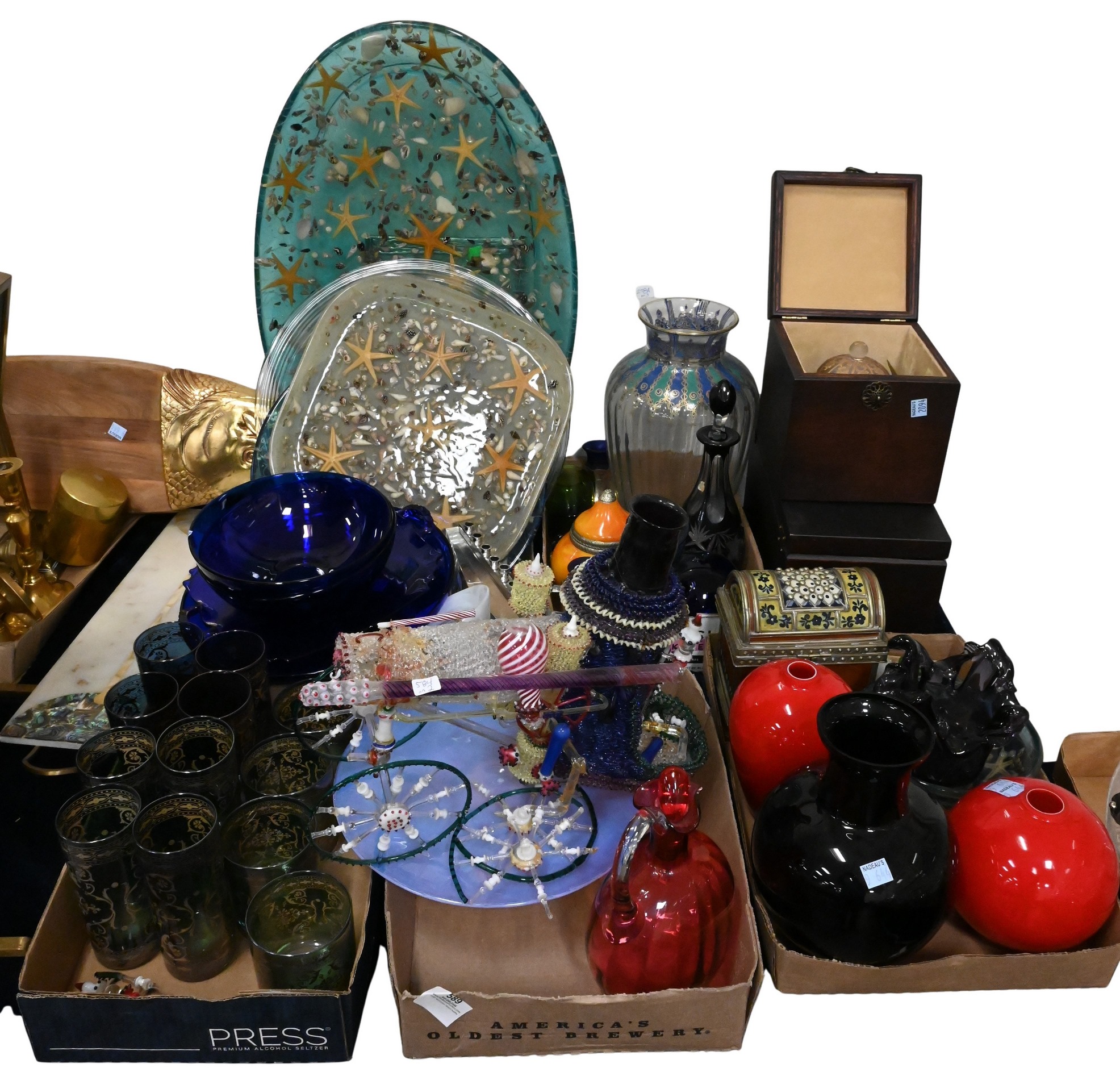 to include Turkish vases in wooden boxes, Venetian vase with gilt accents, moser style glasses, cobalt dishes, decanter, Laslo for Mikasa vases, Tuscan Square seashell platters etc…