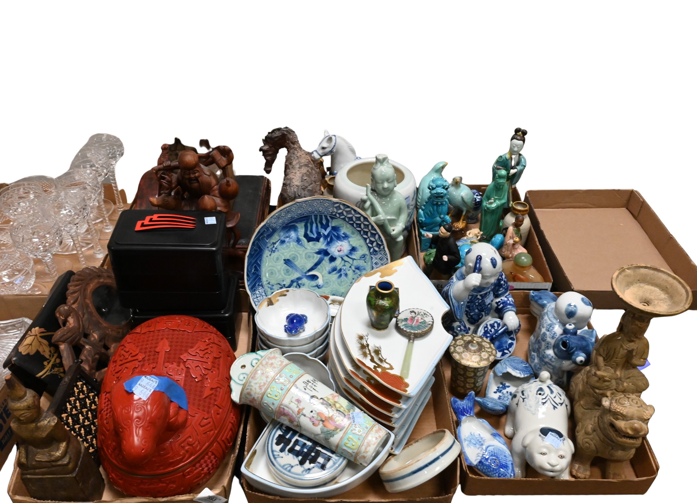 to include turquoise foo dogs and pigeons, Guanyin, blue and white buddhas, fish dishes, reverse painted snuff bottles, celadon figure, Thai carved temple fragments, small hardstone handled mirror with geisha, red lacquer covered ram box, Japanese gilt plates etc…