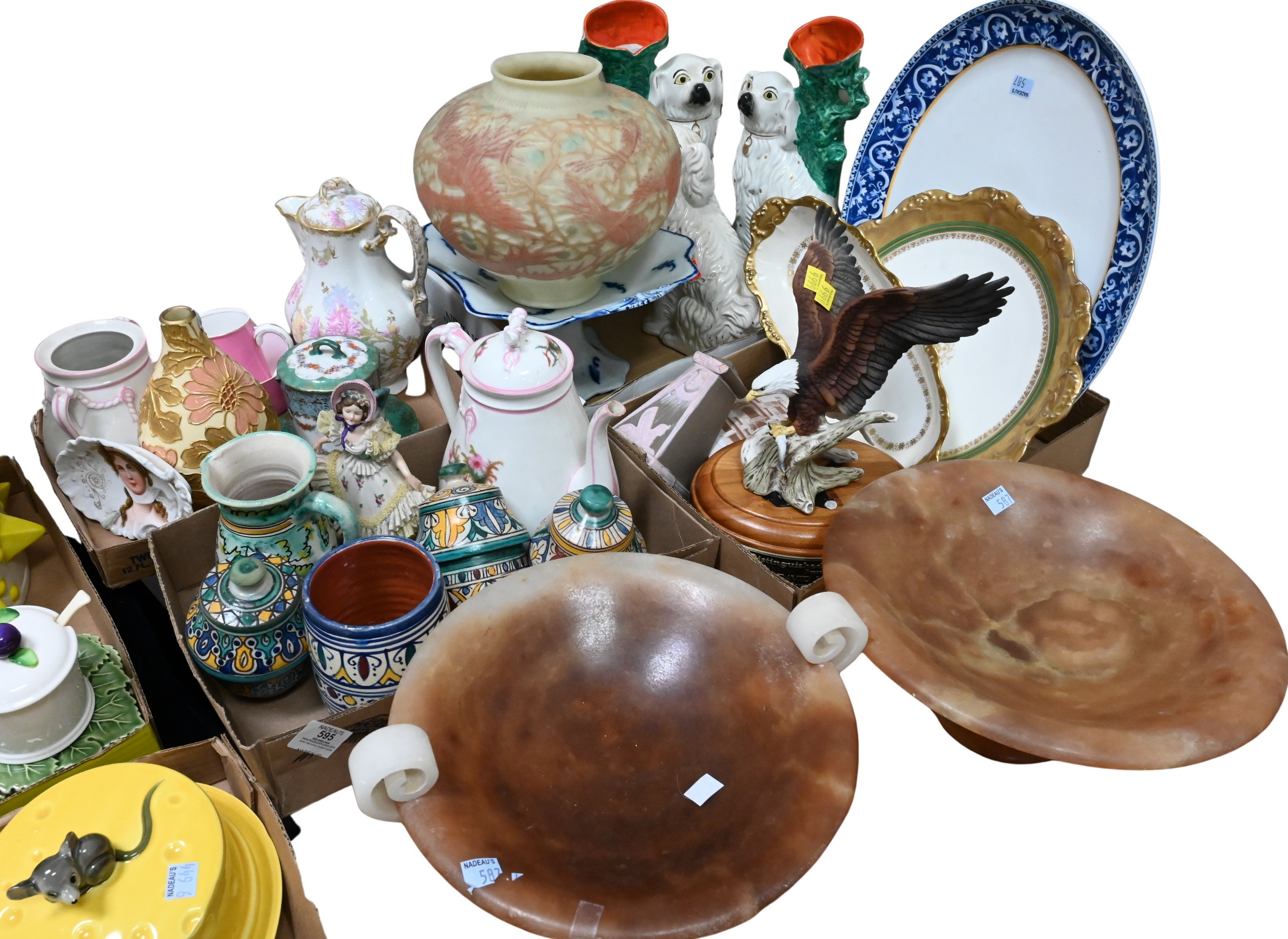 to include two Staffordshire dog spill vases and one dog figure, Majolica canisters, Wedgewood vase with high relief gilt applique, Limoges France coffee pot, Vista Alegre serving platter etc…