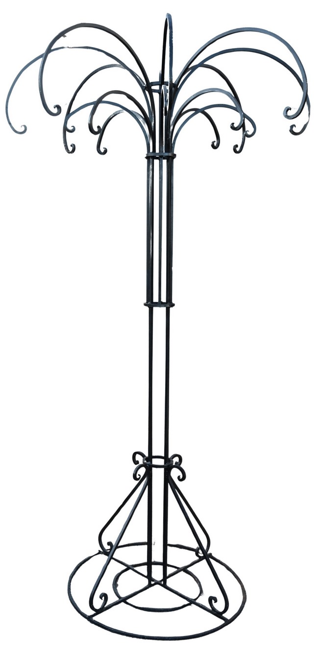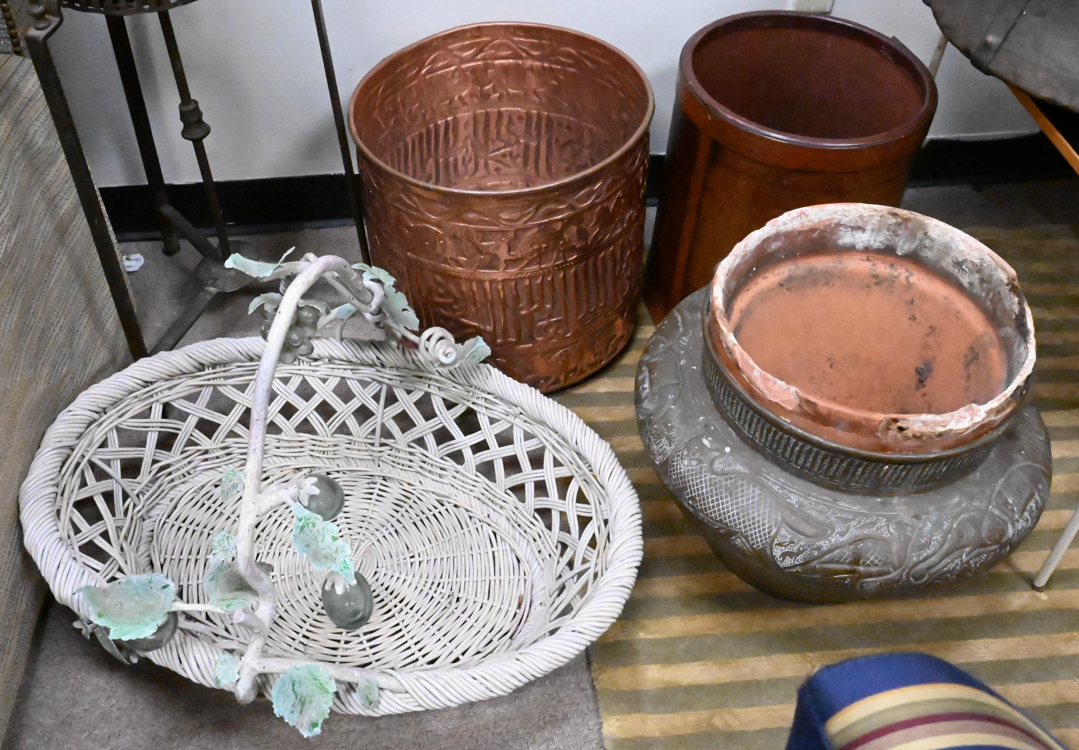 to include metal outdoor planters one on tripod base, wired basket having faux grapes, Moroccan Moorish tole and glass lantern, leather bucket