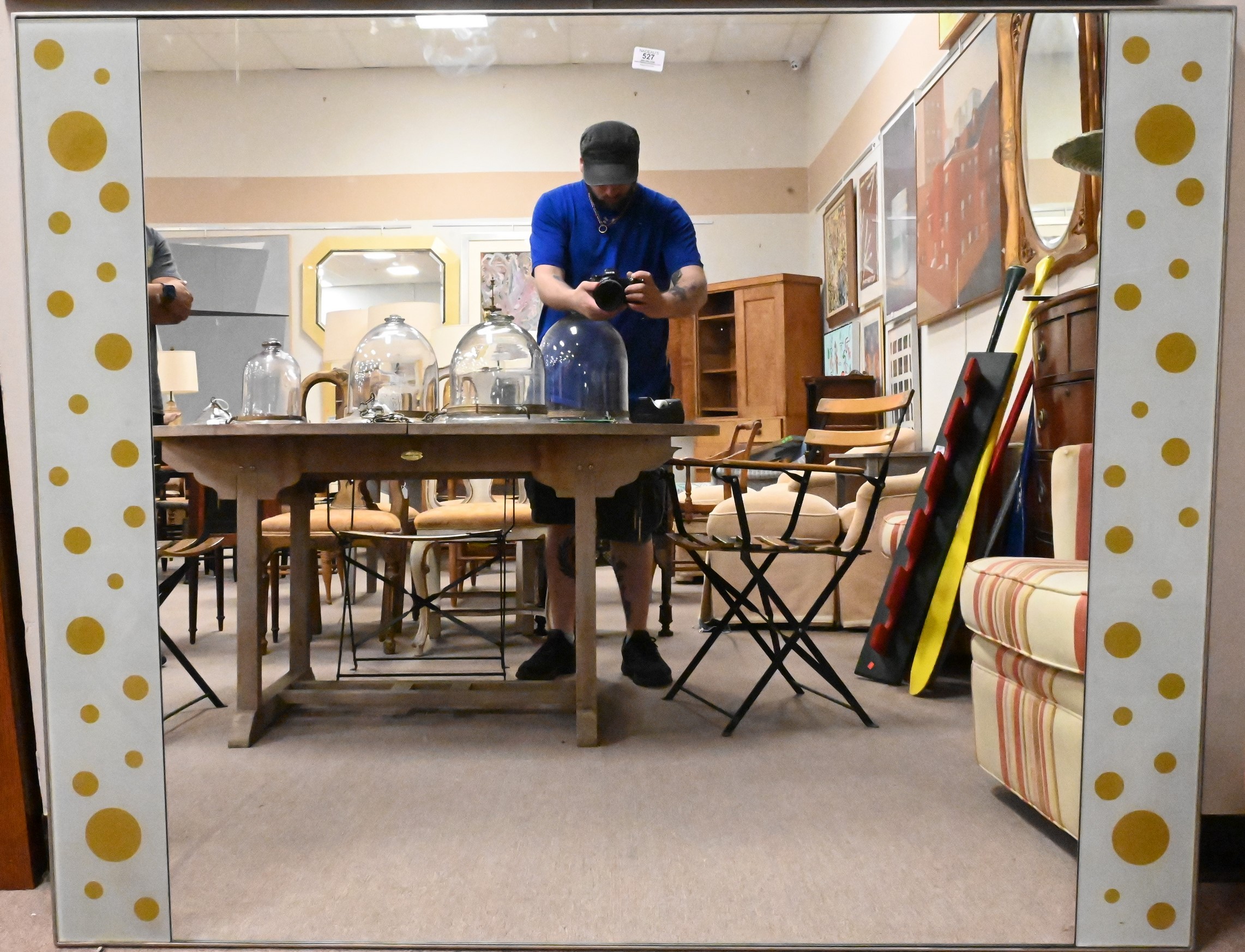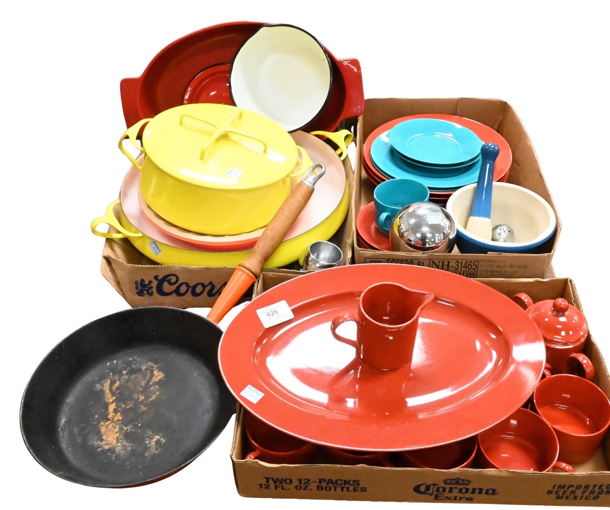 to include Fitz and Floyd cinnabar tea sets with cups, platter plates, Le Creuset mortar and pestle, enamel pots and pans, turquoise Taitu Uno saucers and cup