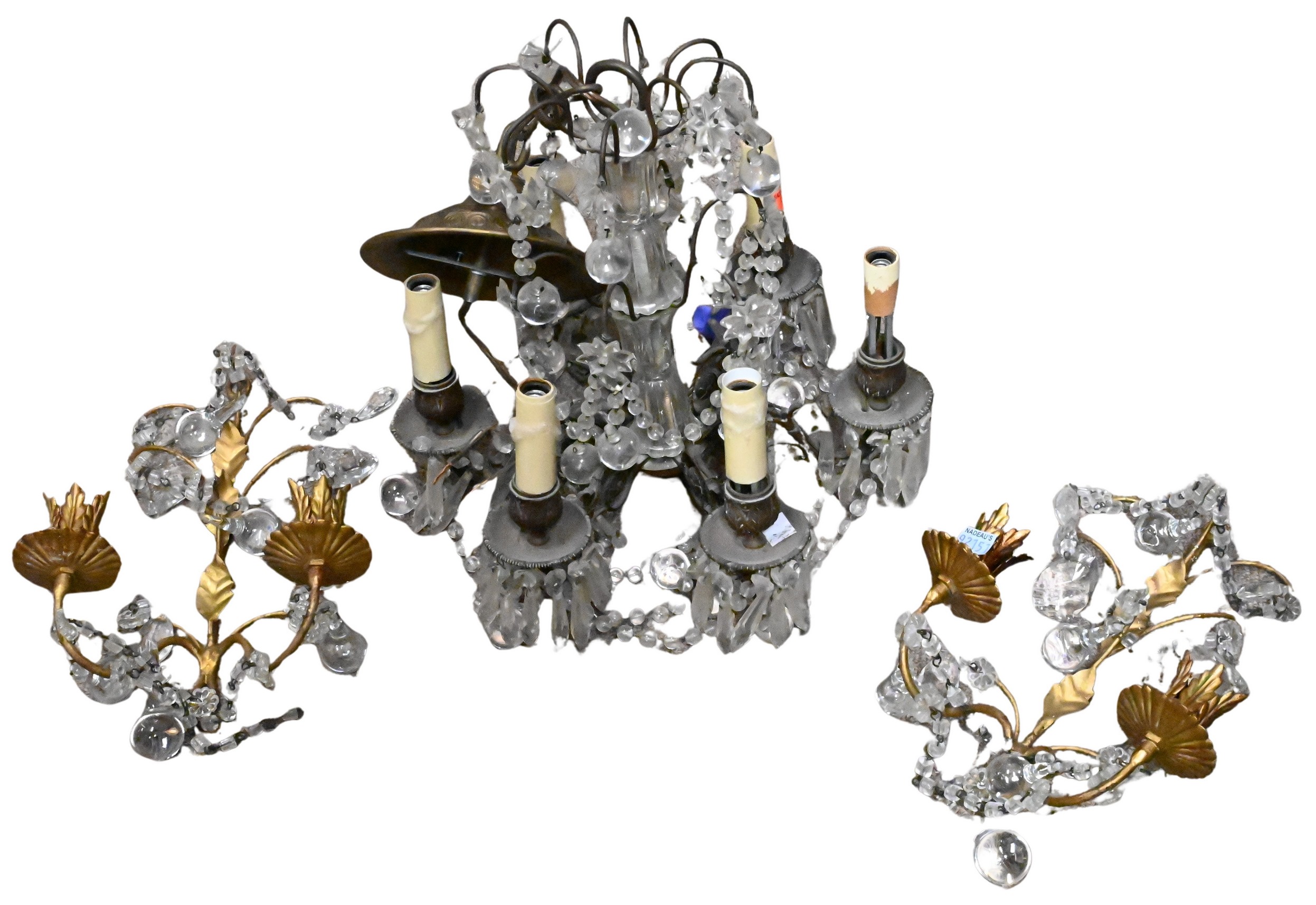 to include pair of two light crystal wall sconces with gilt metal base, along with a six light crystal chandelier with teardrops, stars and swag accents