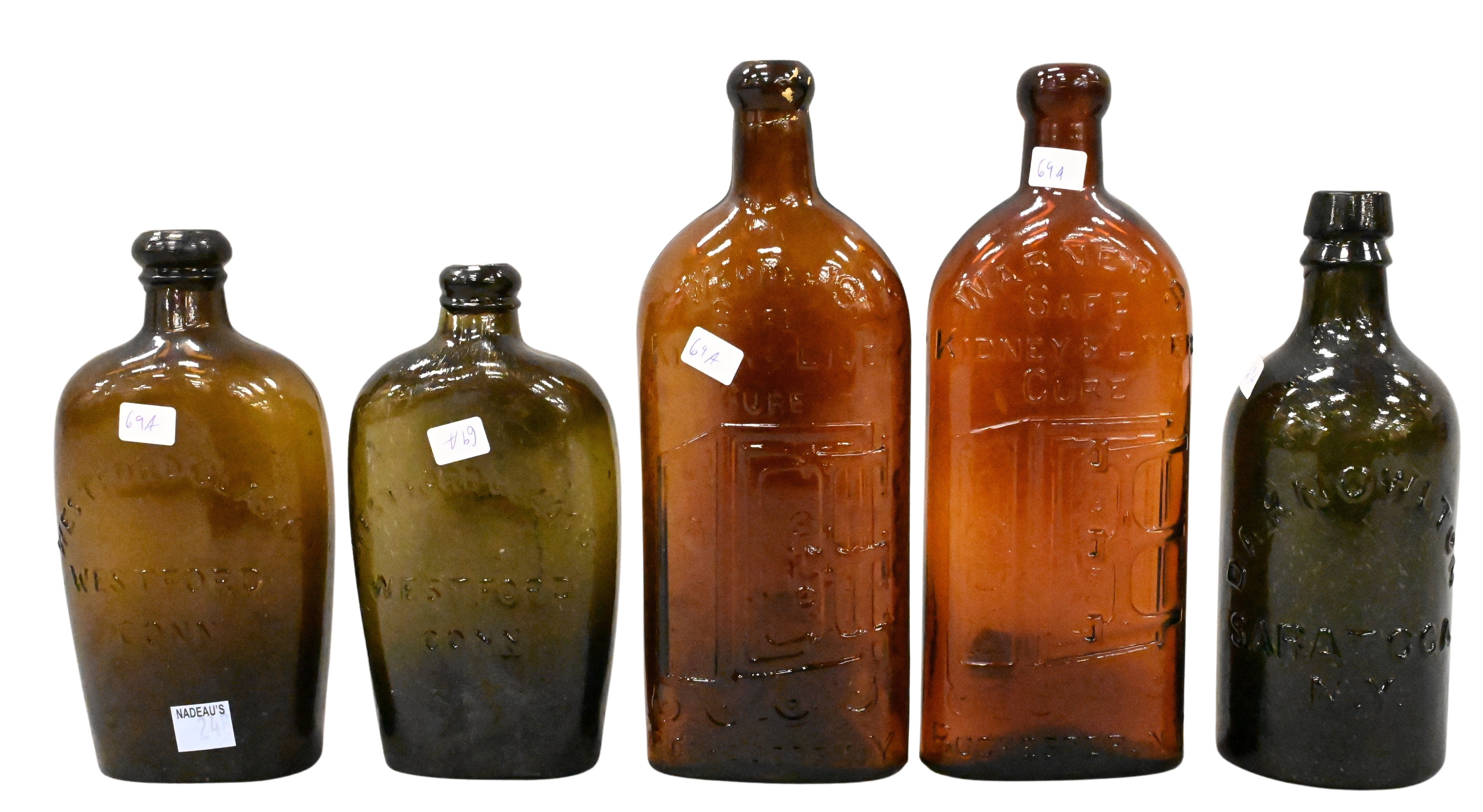 to include a pair marked “Warner’s Safe Kidney and Liver Cure, Rochester, N.Y.,” one marked “D.A. Knowlton, Saratoga, N.Y.,” along with another pair marked “Westford Classic, Westford Connecticut”