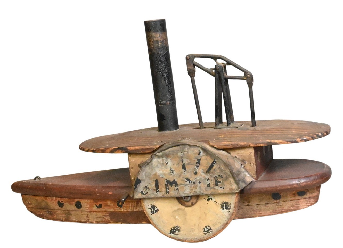 carved and painted steam paddle boat pull toy having metal details and side wheel, circa 1870 by Stevens & Brown