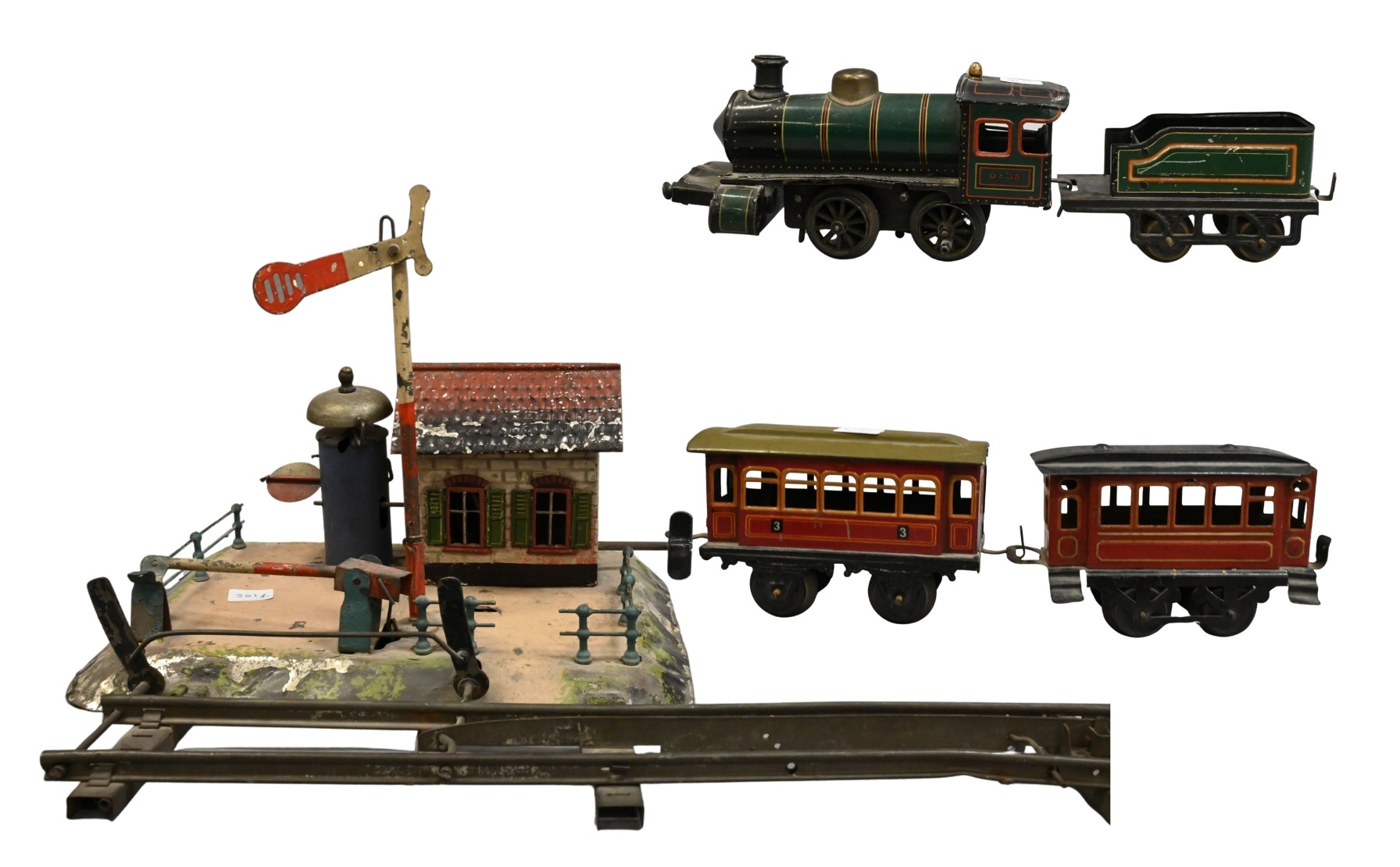 painted tin train engine and three cars, with two additional sections of track, small building accessory