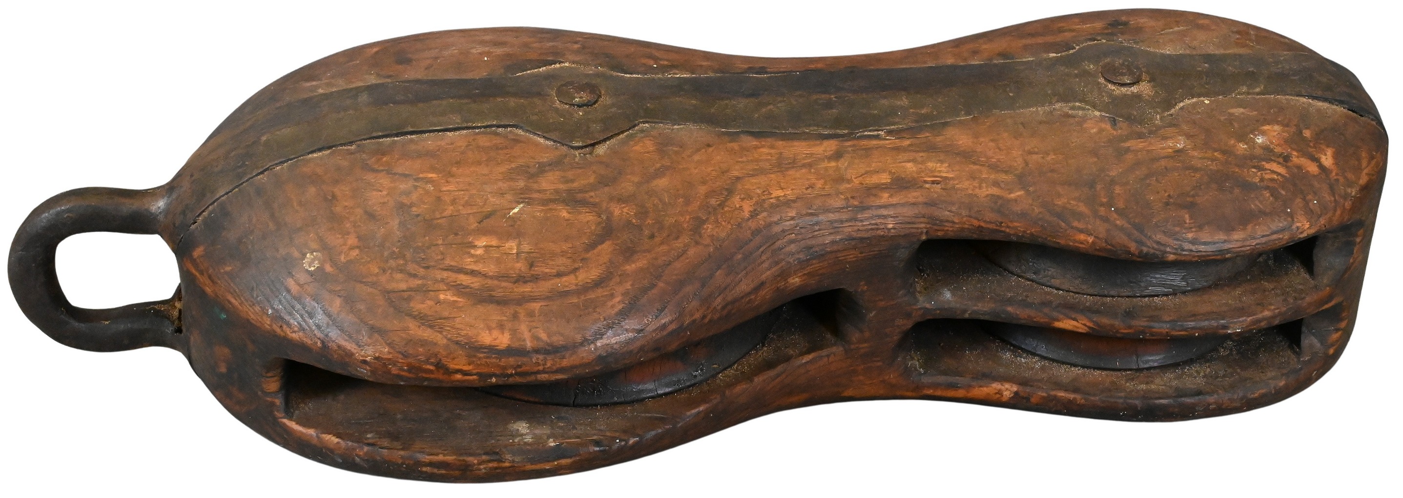 19th Century, A substantial maritime block-and-tackle pulley, the carved hardwood shell of elongated form with central iron mounts, retaining weathered patina from seafaring use.