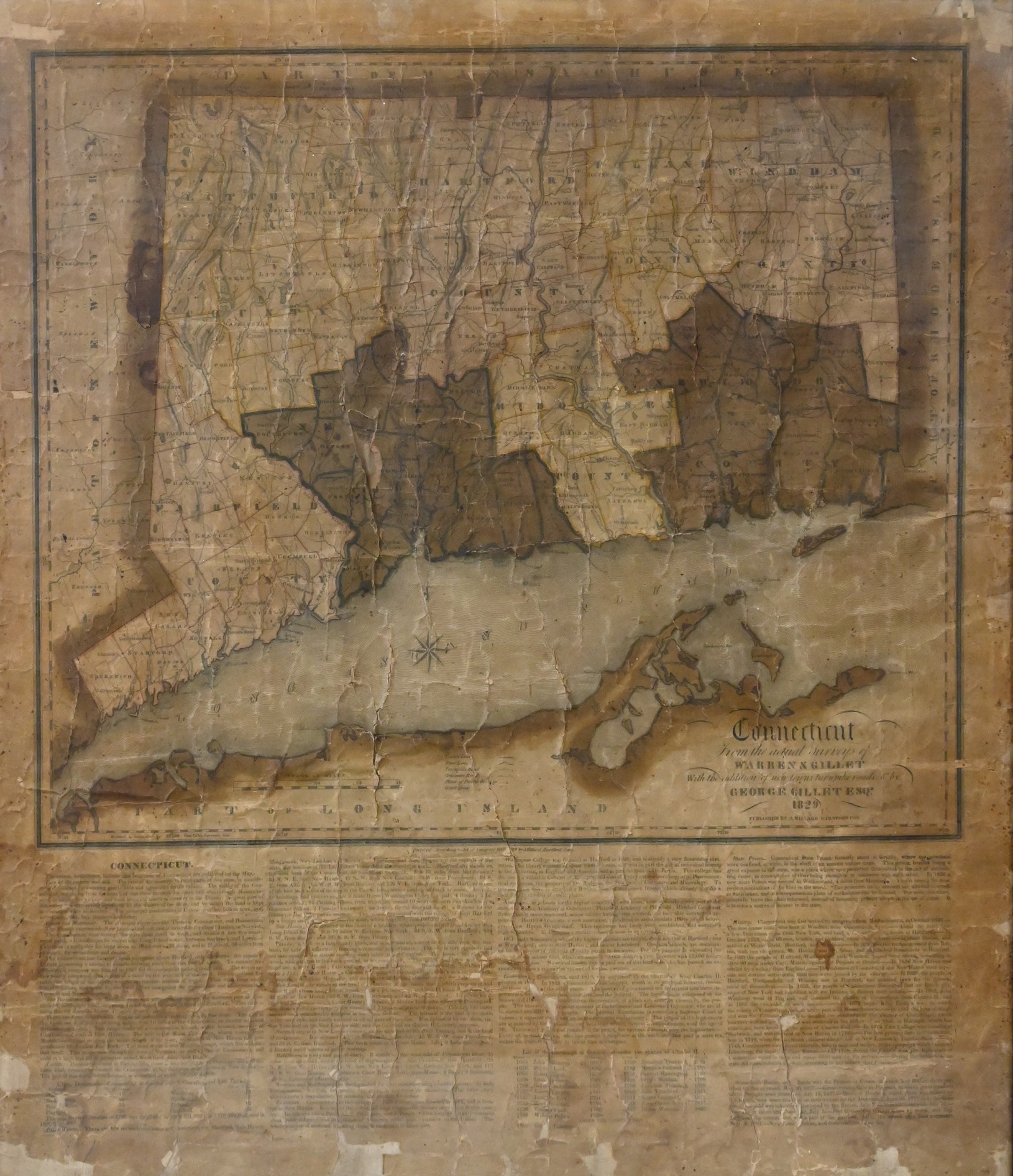 Connecticut from the Actual Surveys of Warren & Gillet, with the Addition of New Towns and Turnpike Roads by George Gillett Esq., 1829. The detailed map outlines towns, roads, rivers, and topographical features, with descriptive text blocks along the lower edge giving historical and geographical notes.